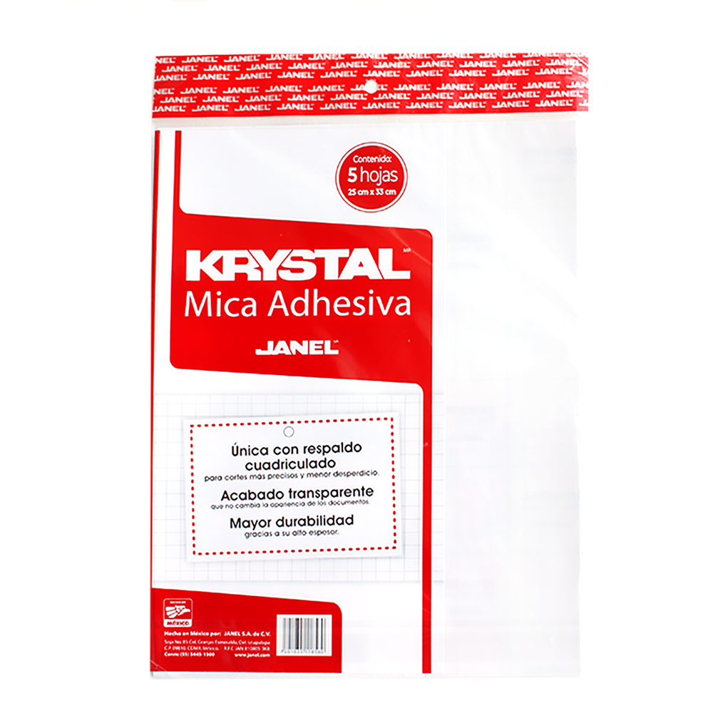 Protege tus documentos o materiales con la mica Krystal adhesiva de Janel, está diseñada para resistir usos fuertes y rigurosos. Es la única mica con respaldo cuadriculado que te brindará mayor precisión en los cortes y minimizar el desperdicio. No altera la apariencia de tus documentos debido a su acabado transparente y cuenta con un alto espesor que te ofrece mayor durabilidad y resistencia. Se presentación contiene 5 hojas de 25X33 cm. ¡Encuéntralo solo en Del Sol!