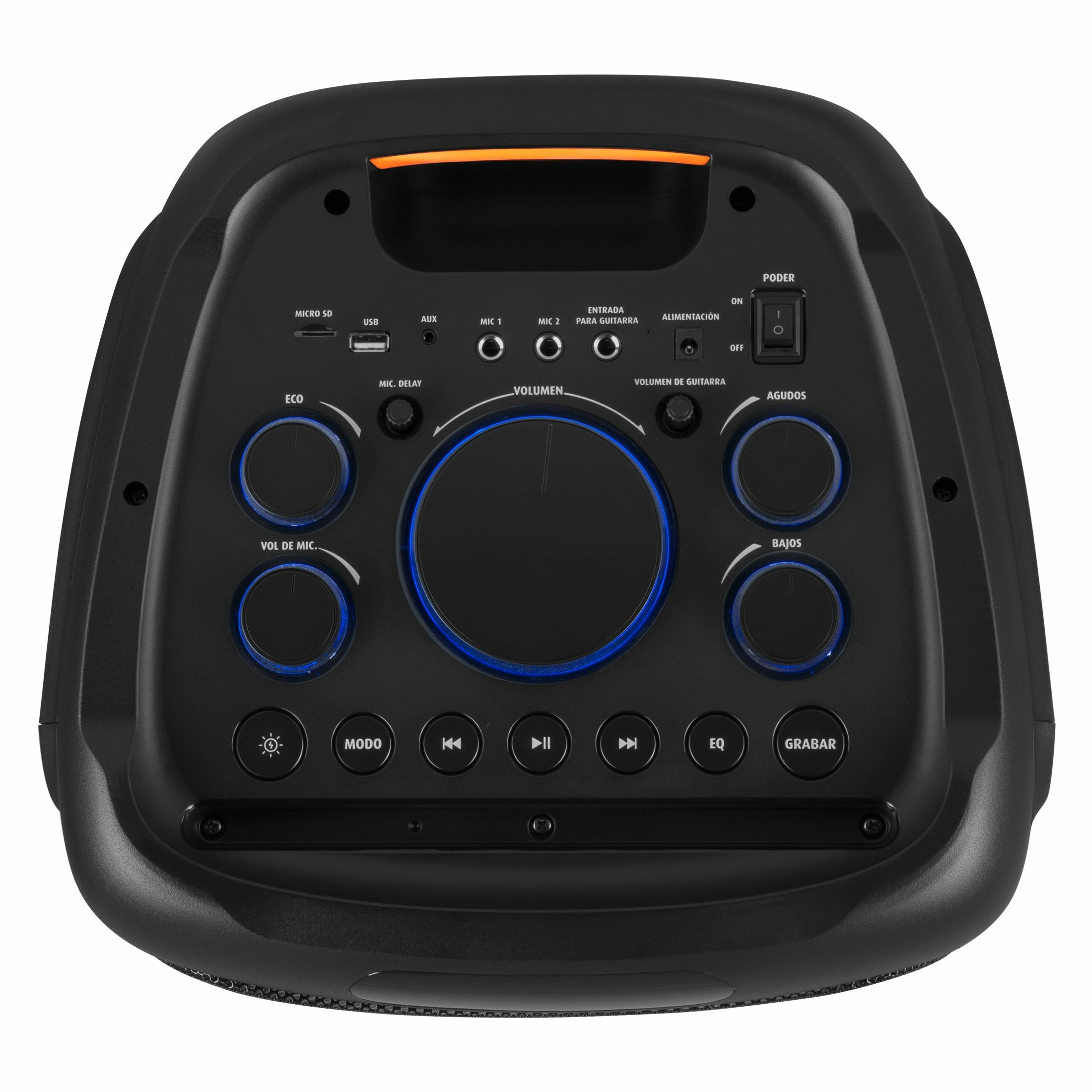 Perillas independientes e iluminadas de agudos y bajos así como eco y retraso en micrófono.