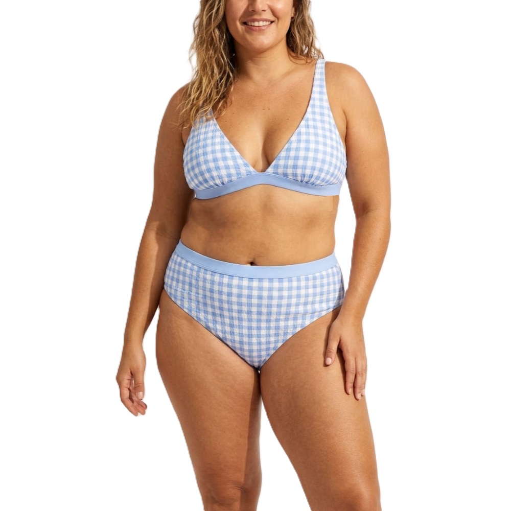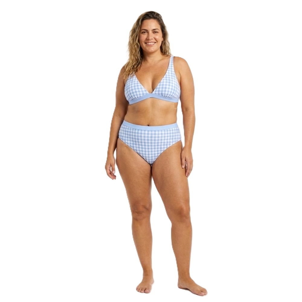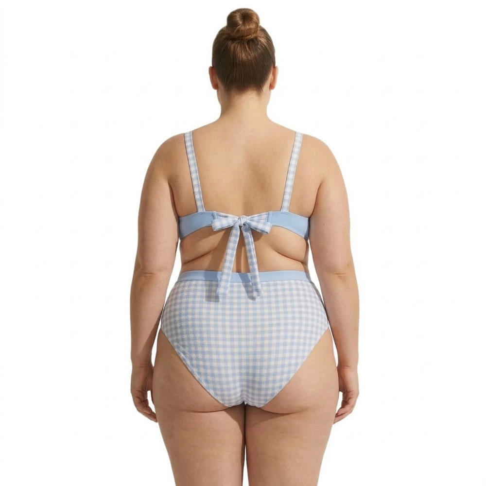 Este bikini dos piezas combina estilo y comodidad en un conjunto moderno. El ajuste de cordones por la espalda permite un calce personalizado, mientras que la cintura y la base elásticas aseguran libertad de movimiento y confort. Su diseño de cuadros aporta un toque fresco y llamativo, ideal para disfrutar de la playa o la piscina con confianza.