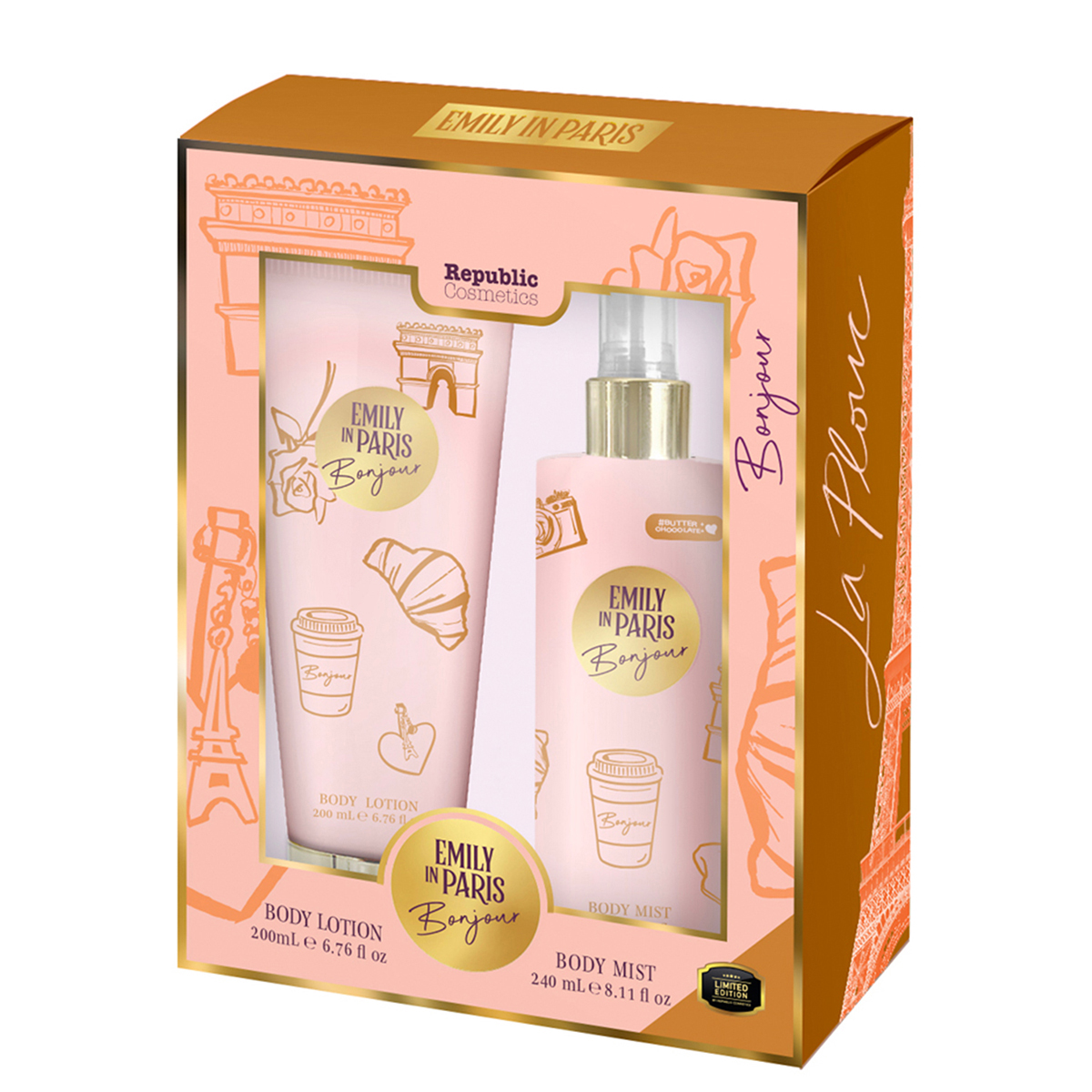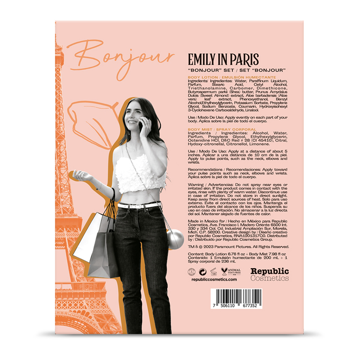 Disfruta de este set de Body Lotion y Body Mist Bonjour inspirada en la serie Emily in Paris, de la marca Republic Cosmetics que te encantara. Transpórtate a un día por la mañana en los cafés de París con su fórmula adicionada con toques de cereza, vainilla, gardenia, sándalo y roble. Humecta todo tu cuerpo y disfruta de su esencia con una fragancia única. Luce una piel súper hidratada, suave y con un aroma duradero.