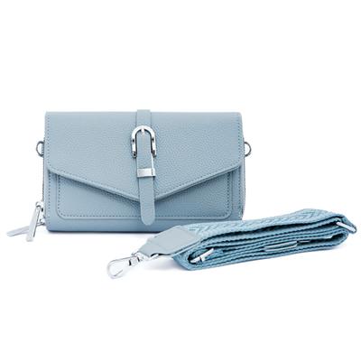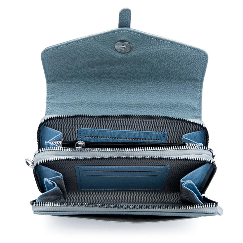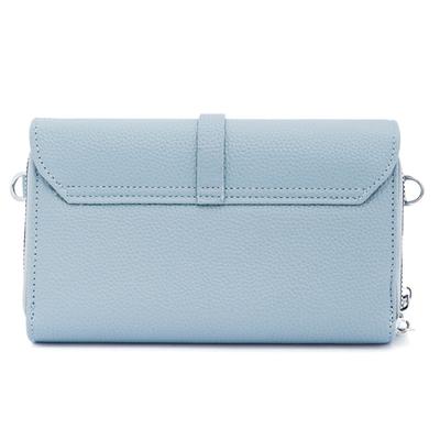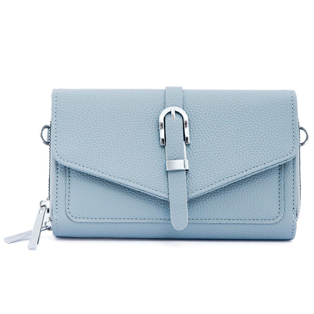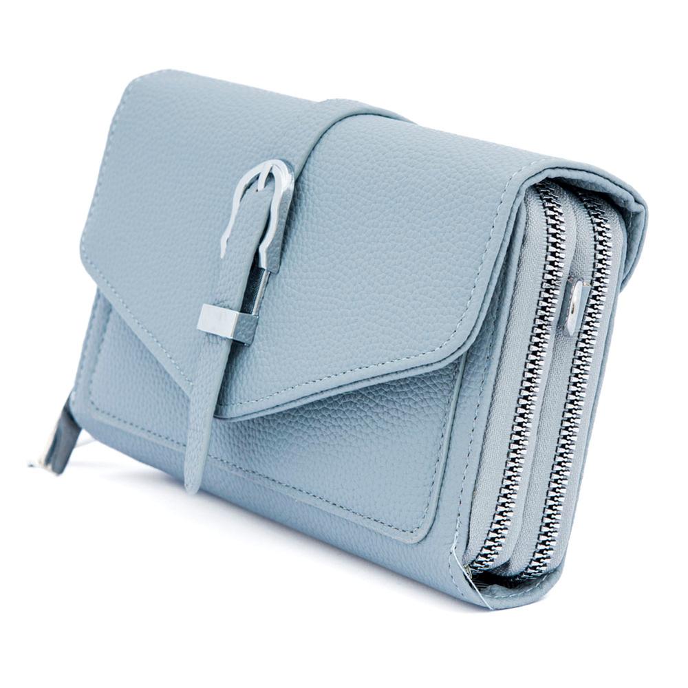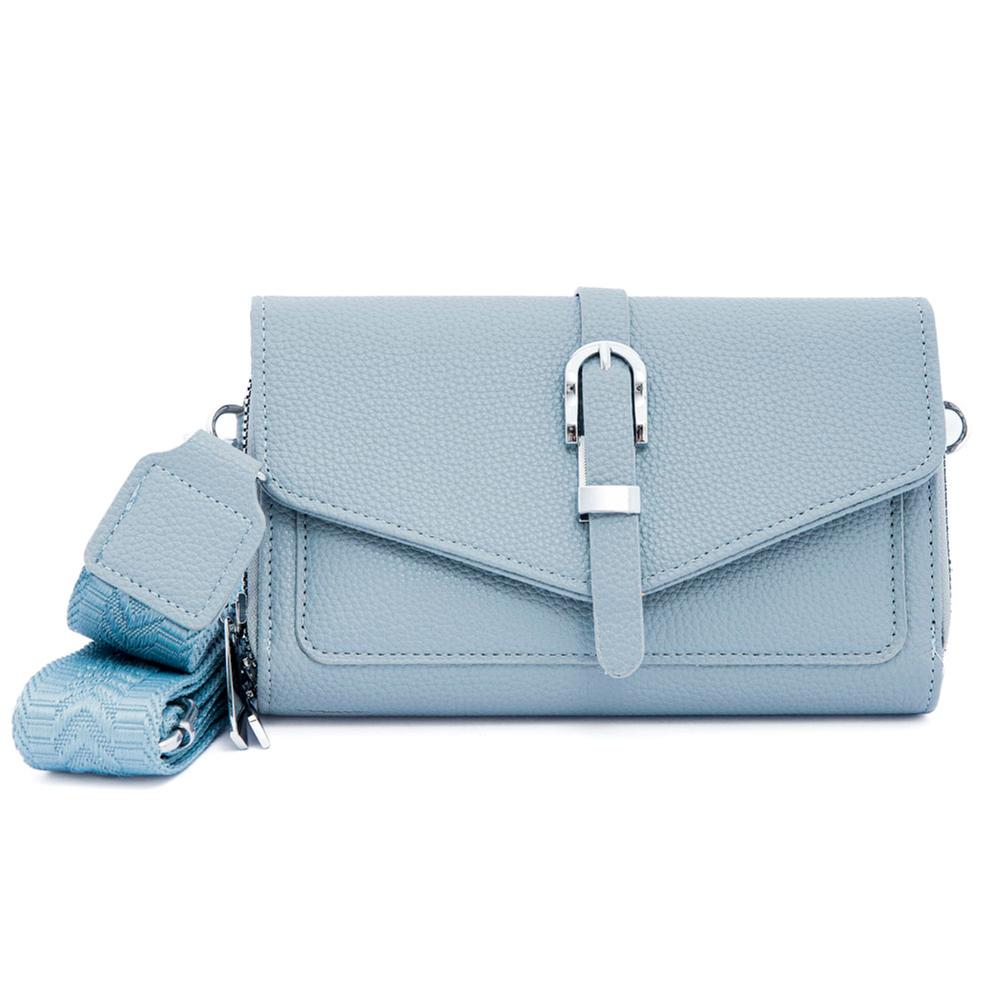 Bolsa azul tipo cartera con hebilla decorativa y detalles metálicos, elegante y versátil para uso diario.