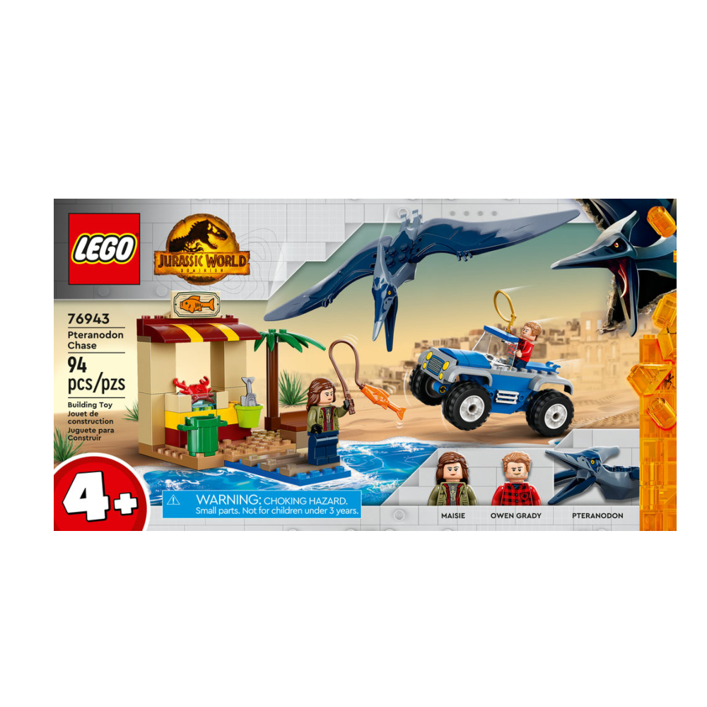 Los niños podrán aprender a construir e interpretar emocionantes historias inspiradas en Jurassic World con el set Cacería del Pteranodon, contiene modelos de un buggy de juguete, un puesto de pescado y un muelle. Incluye también una figura articulada de juguete de un Pteranodon y 2 minifiguras con elementos que representan una caña de pescar y un lazo para estimular el juego creativo.