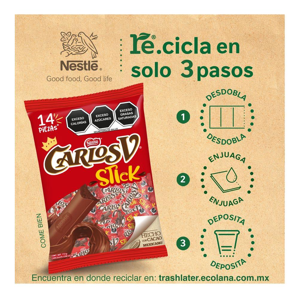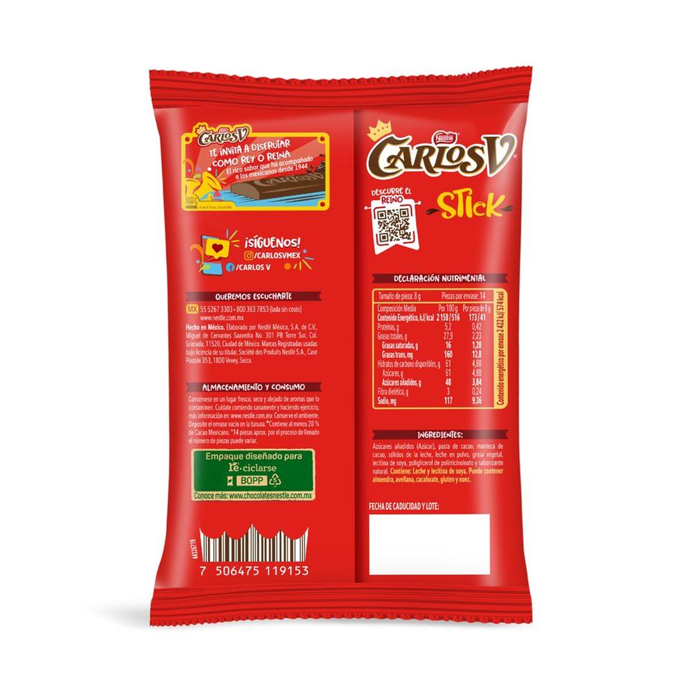 Siéntete como rey con el chocolate Carlos V y disfruta de su increíble sabor, hecho con cacao mexicano, déjate envolver por la mágica experiencia gustativa que te ofrece, saciará tu antojo transportándote a universo rico en sensaciones, disfruta de su versión stick, el tamaño justo para llevar contigo a cualquier lado.