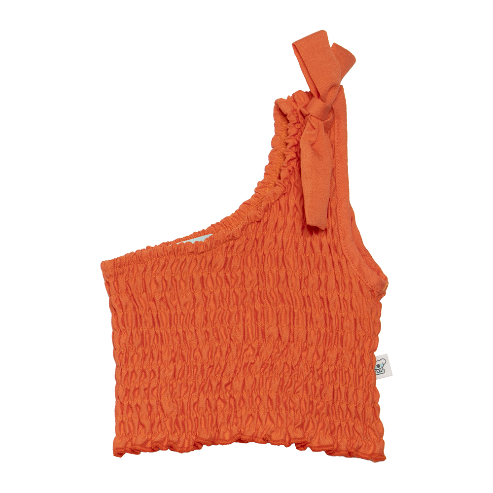 Top: Amarre en tirante, hombro descubierto, diseño con smock