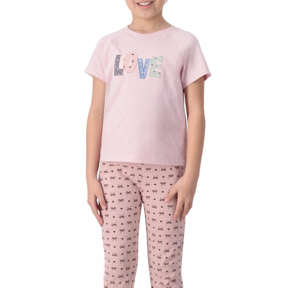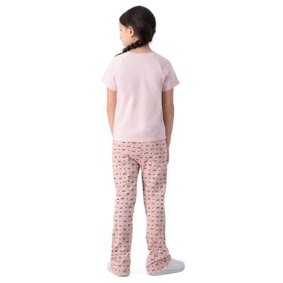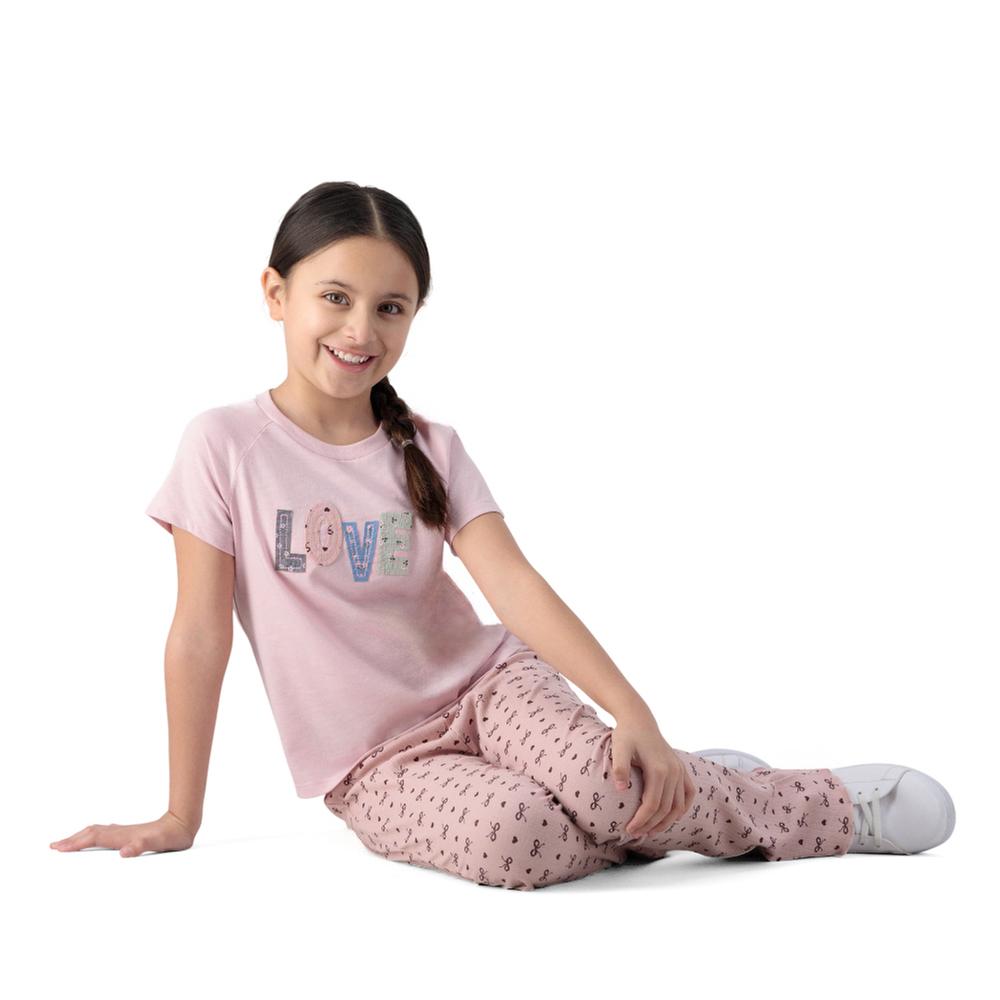 Conjunto para niña que incluye una playera de manga corta con estampado frontal y un pantalón de tiro medio con elástico. El diseño full print de moños en el pantalón crea un look tierno y coordinado, ideal para el juego diario.