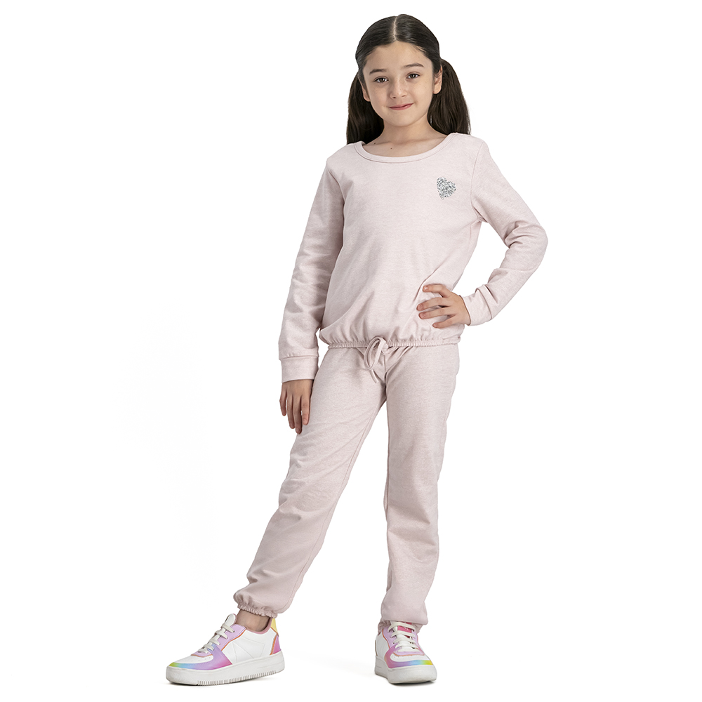 Blusa: Cuello redondo, manga larga con ajuste en puños, jareta en ruedo, diseño corazón en pecho.