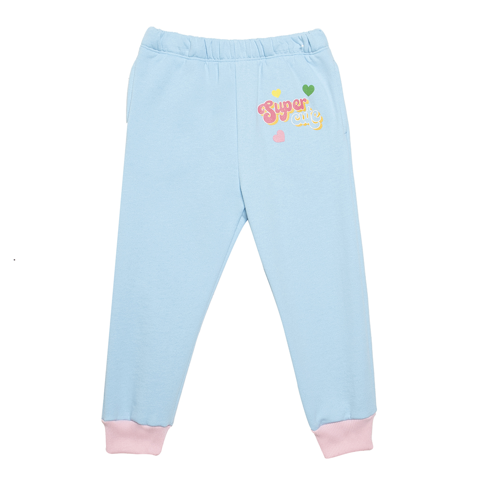 Pants: Elástico en cintura, ajuste en puños, bolsas, leyenda frontal.