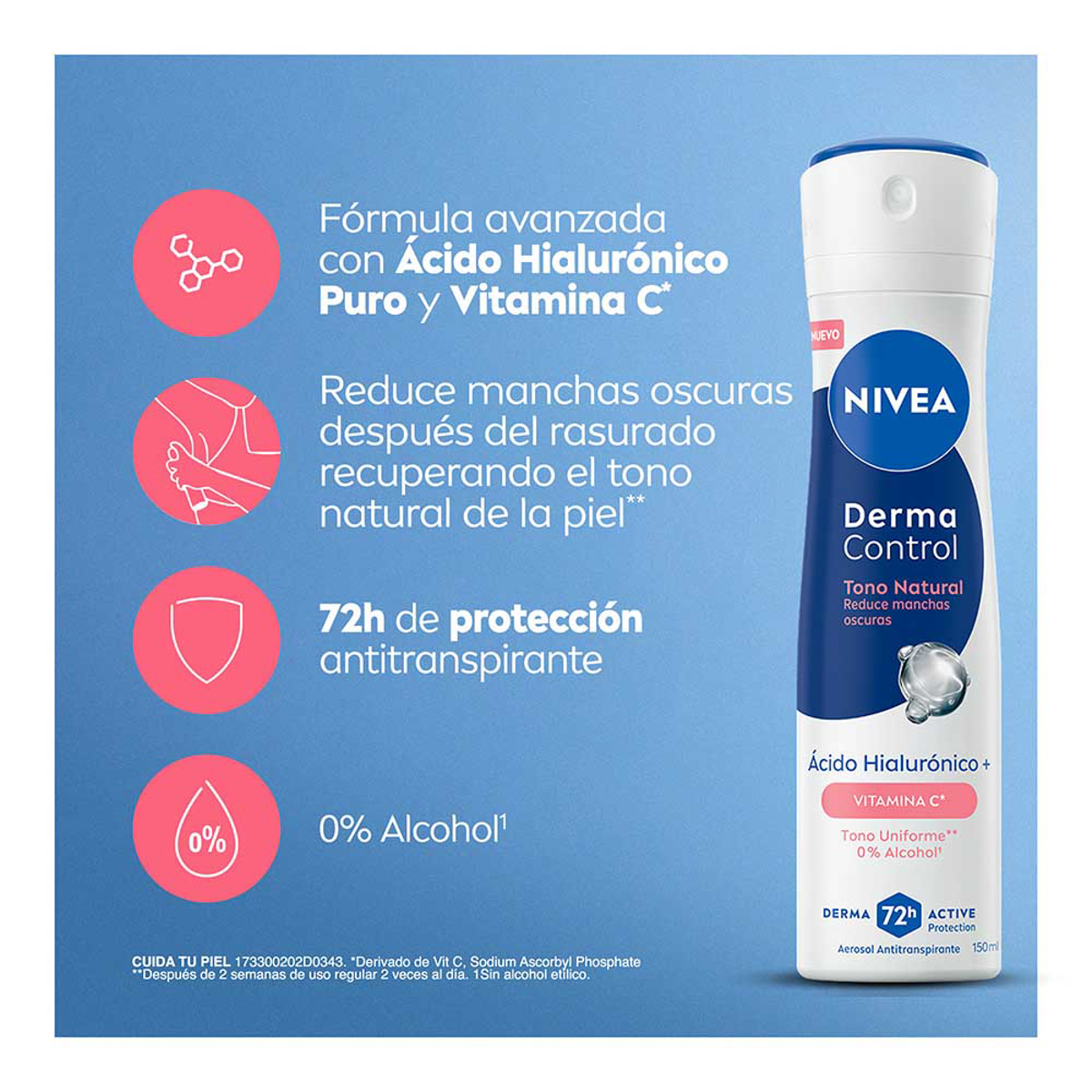 Recupera el tono natural de tu piel con Nivea Derma Control. Luce unas axilas impecables con este antitranspirante en aerosol, no solo te ofrece una protección extrema contra el sudor, sino que actúa activamente para reducir las manchas oscuras y unificar el tono de tu piel. Gracias a su exclusiva fórmula potenciada con ácido hialurónico y vitamina C, este desodorante proporciona un cuidado dermatológico profundo que hidrata y renueva la apariencia de la piel con cada aplicación. Disfruta de una sensación de frescura y seguridad por hasta 72 horas.