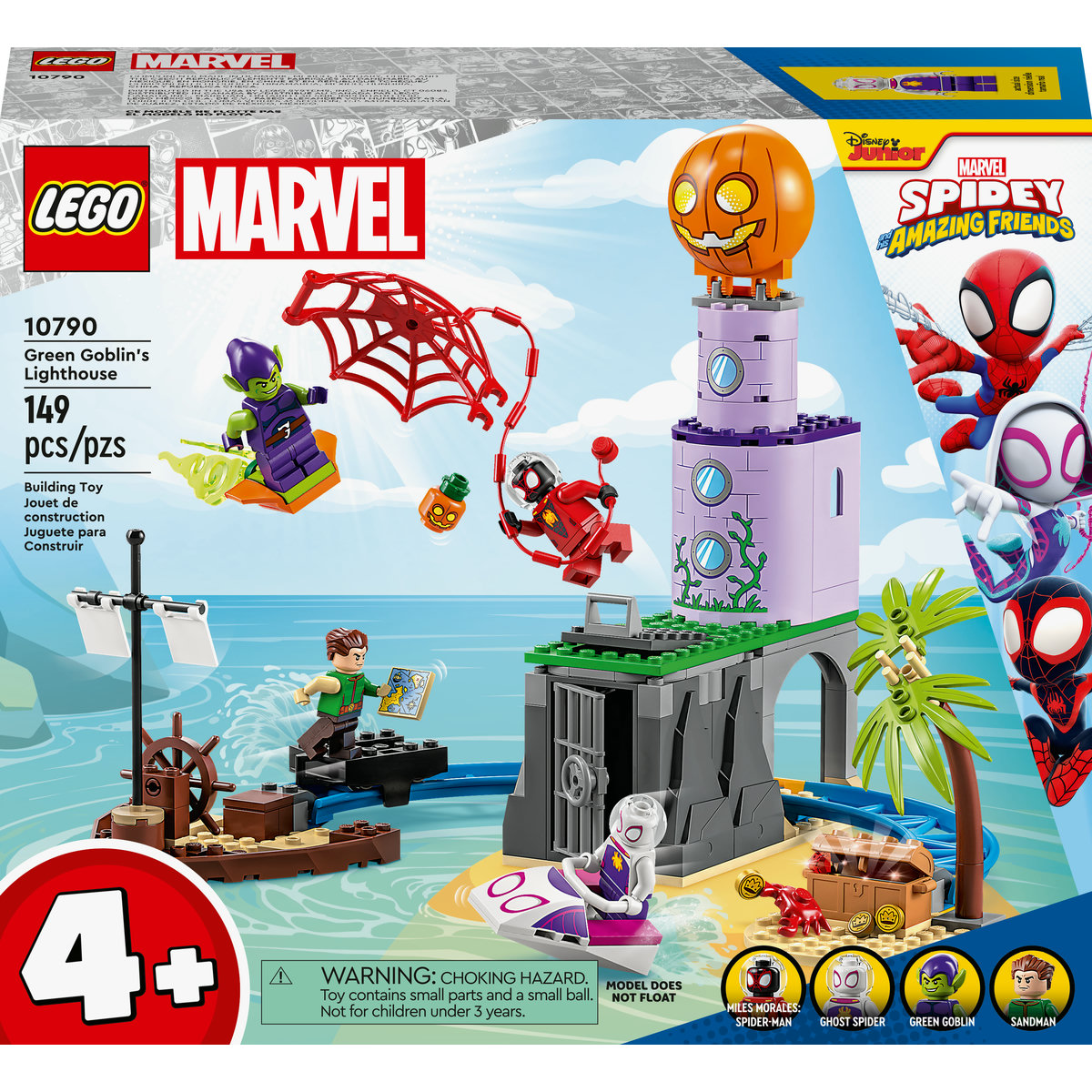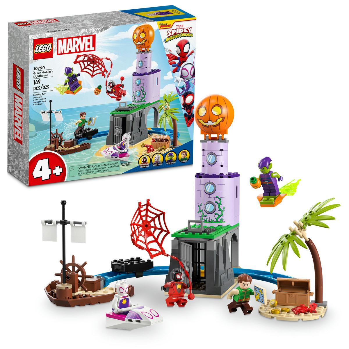 Desde la cueva subterránea hasta la calabaza ubicada en lo alto, el set Lego de Equipo Spidey en el Faro del Duende Verde está lleno de acción diseñada para niños a partir de 4 años. Incluye cuatro minifiguras (Miles Morales, Spider-Woman, Sandman y Duende Verde), un barco pirata naufragado, una vía por la cual transportar el tesoro robado, base del supervillano y numerosos accesorios.