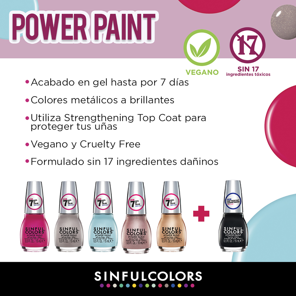 Sinful Colors trae para ti su nueva familia de esmaltes de acabado en gel, Power Paint. Esta nueva línea de esmaltes te dejará color intenso hasta por 7 días seguidos. Su nueva fórmula es 57% más gruesa que la de la familia de Sinful Shine, la anterior familia tipo gel de la marca. Power Paint cuenta con Polímeros de calidad profesional y manteca de karité para crear una barrera protectora sobre las uñas que ayudan a su crecimiento. Cuenta con un cepillo nuevo y mejorado para cubrir tu uña completa desde la primera pasada de esmalta. Además, el nuevo Top Coat dejará una capa protectora sobre el color para evitar quiebres.