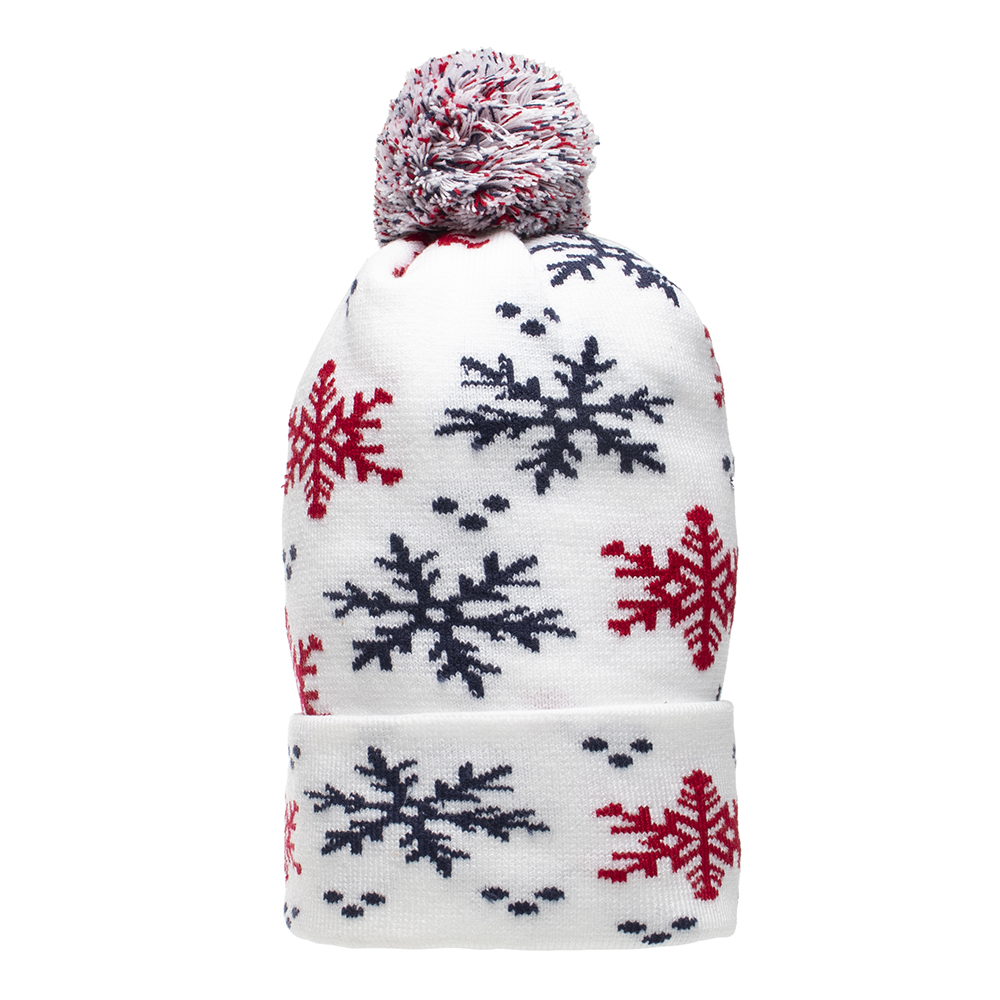 Nuestro gorro de mujer con full print de copos de nieve te mantendrá calentita y a la moda. Con su suave tejido, doblez y pompón esponjoso, es el accesorio perfecto para disfrutar de la temporada navideña.