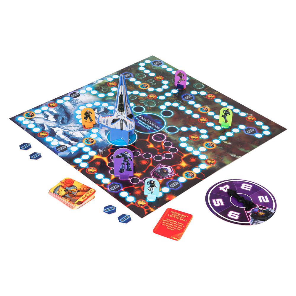 Contenido: 1 tablero de juego, 25 tarjetas de reto, 5 peones de cartón, 5 bases plásticas para peones, 1 nave de cartón, 8 tokens de cartón, 1 ruleta de cartón, 1 instructivo