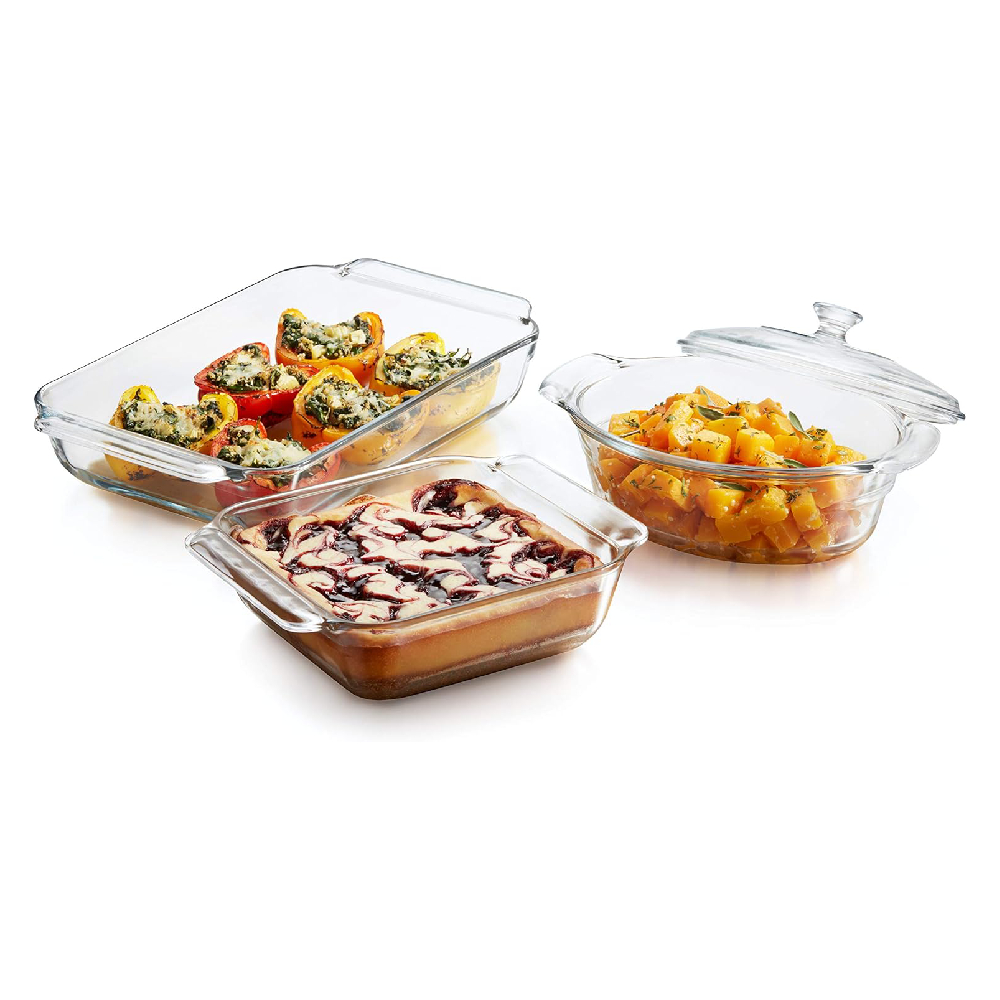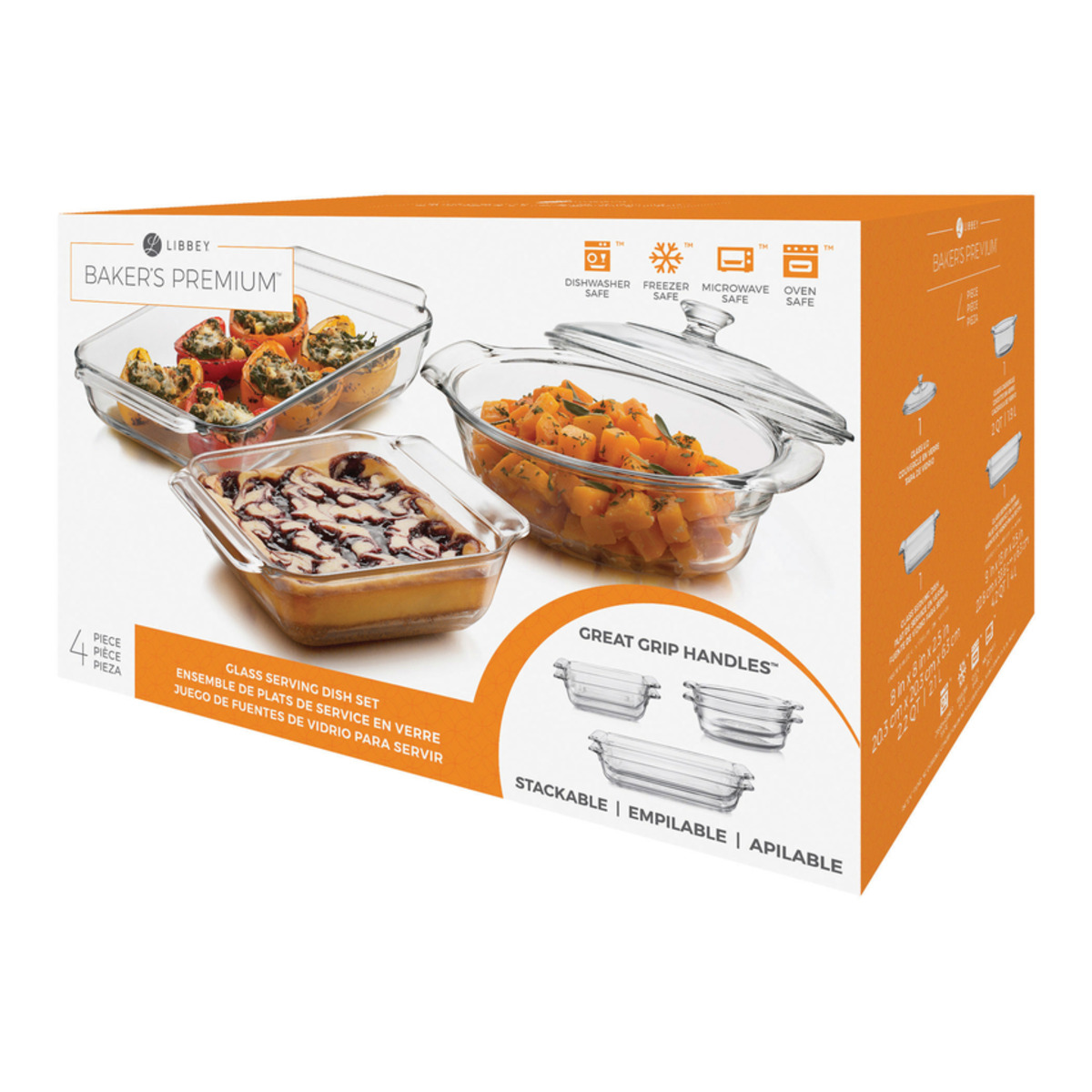 Consigue exquisitos platillos con el juego de hornear Premium de Libbey. Este conjunto de cuatro piezas es perfecto para equipar tu cocina y elaborar una gran variedad de recetas cómodamente en casa. Está fabricado 100% de vidrio resistente, transparente y duradero. Incluye una bandeja rectangular, otra bandeja cuadrada y una cacerola ovalada con tapa, que además son apilables.