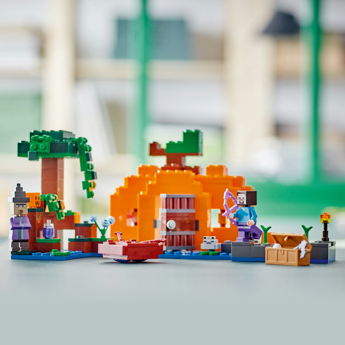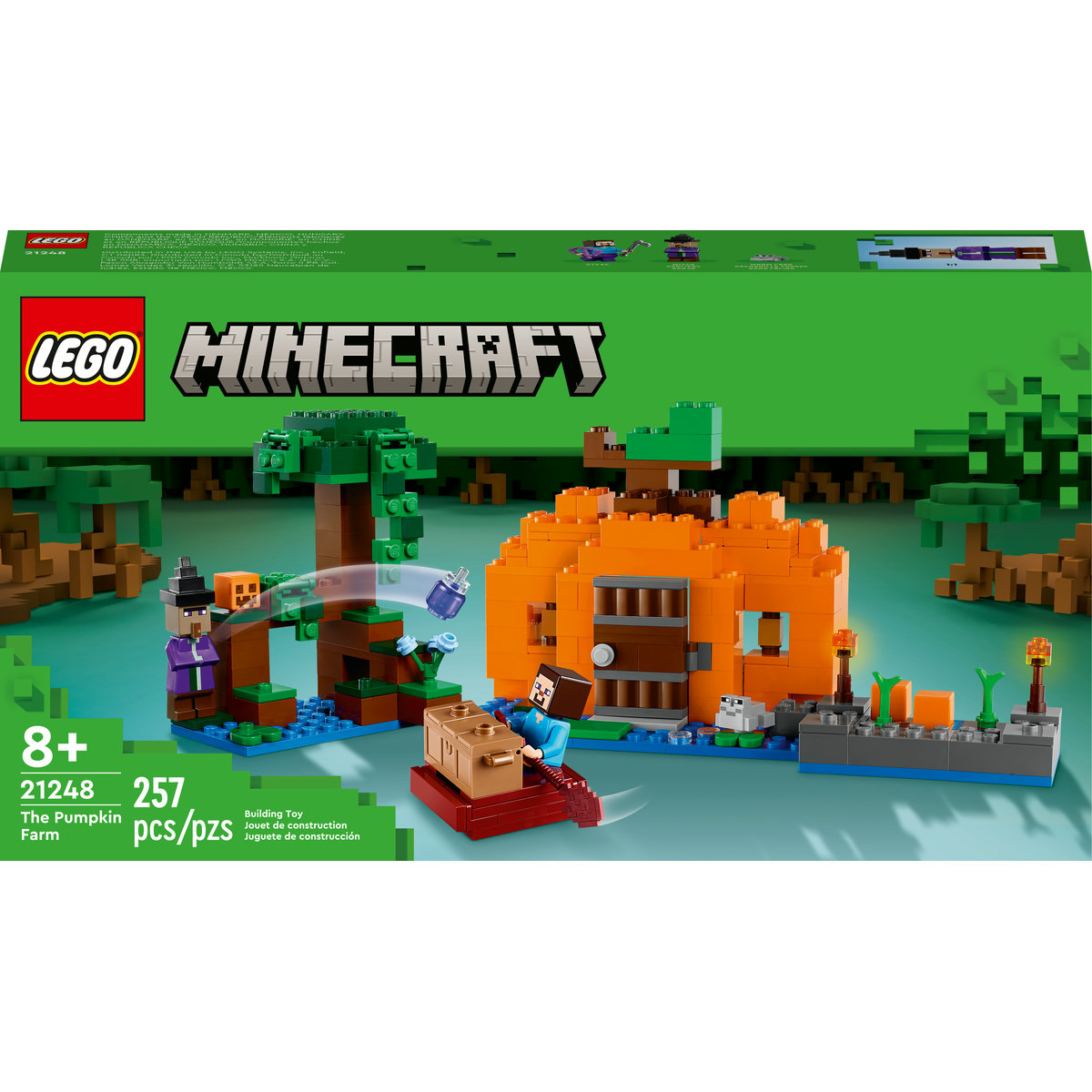 Disfruta de emocionantes aventuras en el bioma Pantano con el set Lego Minecraft La Granja-Calabaza 21248, ideal para niños a partir de 8 años. Construye una casa con forma de calabaza completamente amueblada y un huerto donde Steve cultiva calabazas con su azada. Enfrenta la amenaza de una malvada Bruja que lanza pociones mientras Steve se defiende con su arco. El set incluye además una rana, un barco y un cofre con huevo y azúcar para preparar un delicioso pastel de calabaza.