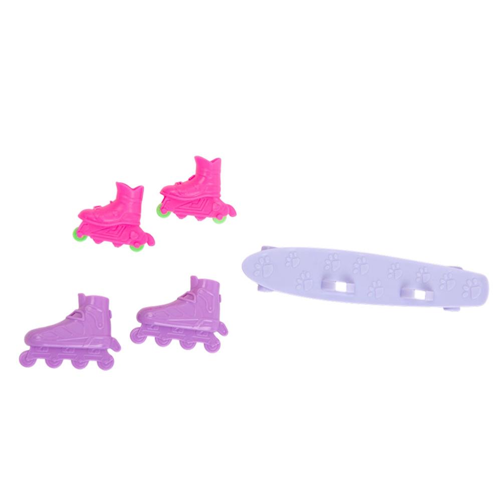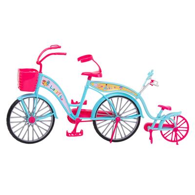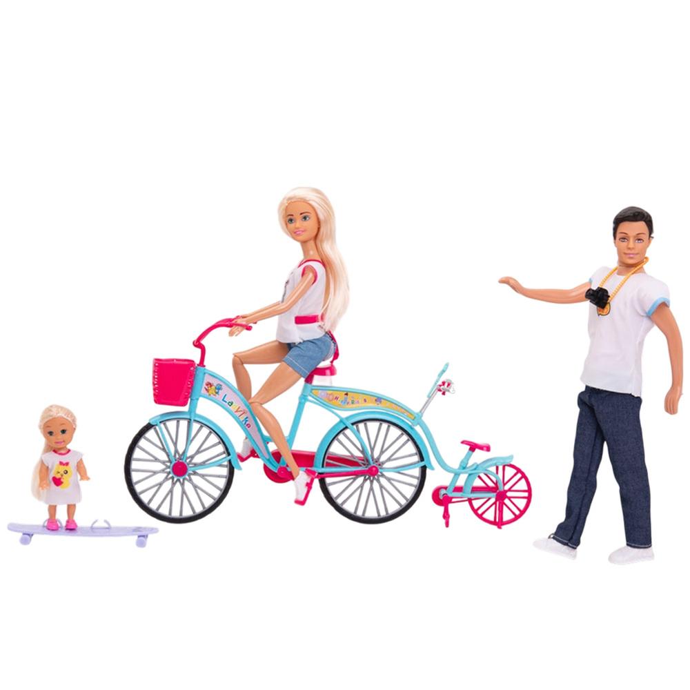 Muñeca con bicicleta doble, patineta, dos pares de patines y cámara fotográfica