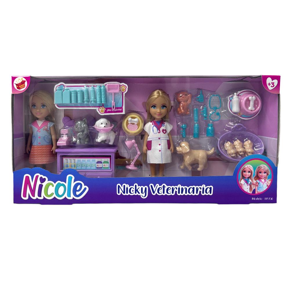 Descubre la magia de las muñecas Nicky Veterinaria, de Nicole. Tienen un encantador tamaño de 11 cm para llevar una maravillosa experiencia de juego a donde vayas. Incluyen emocionantes mascotas que estimulan la creatividad e imaginación, lo que permitirá a las niñas crear infinitas historias. Con su estilo atractivo y colorido, no solo son un excelente regalo, sino también un magnífico set para complementar su colección.