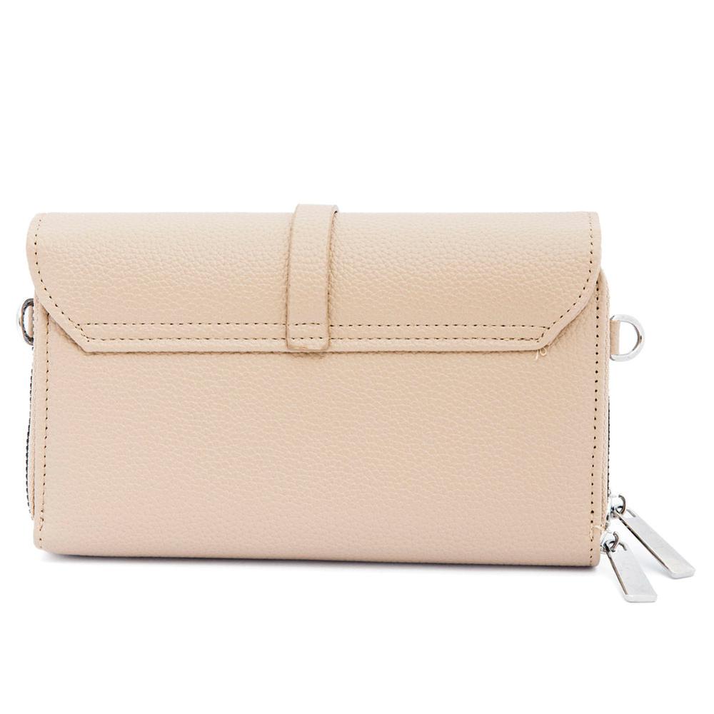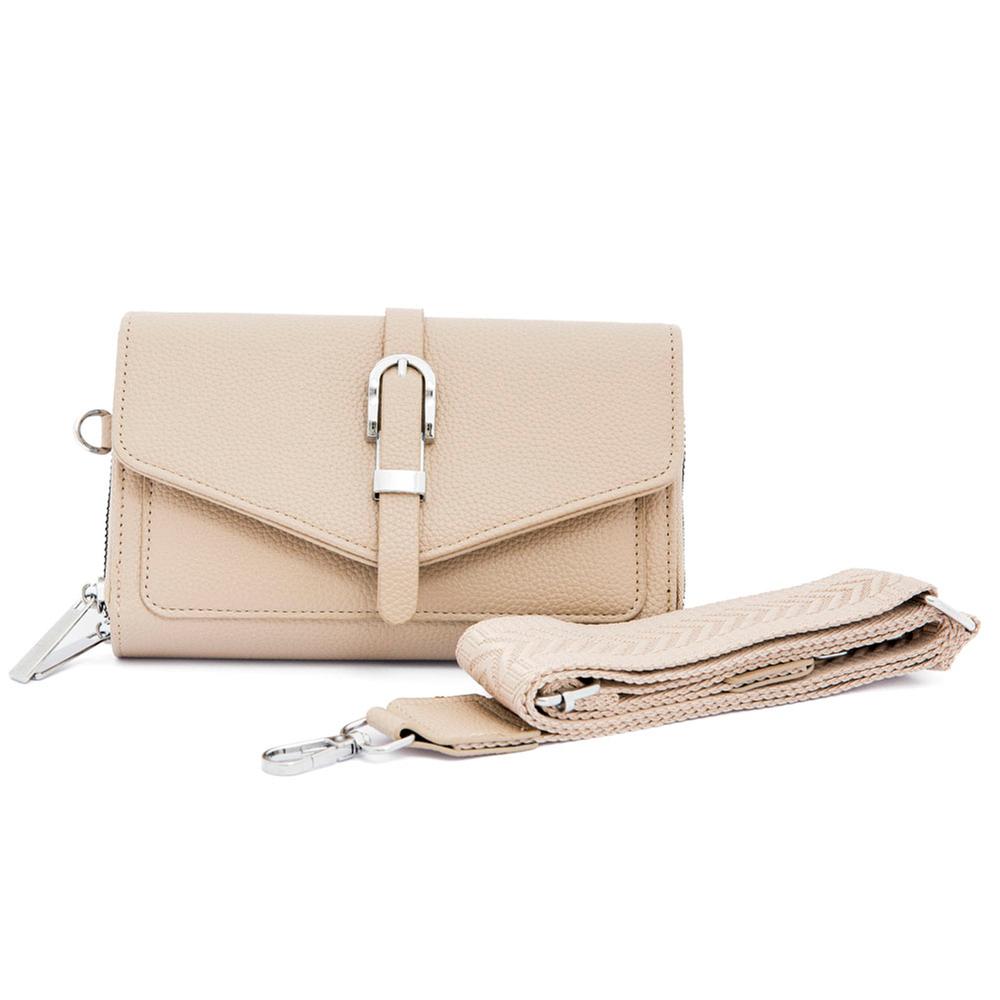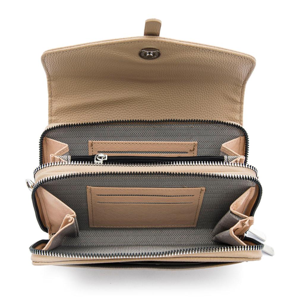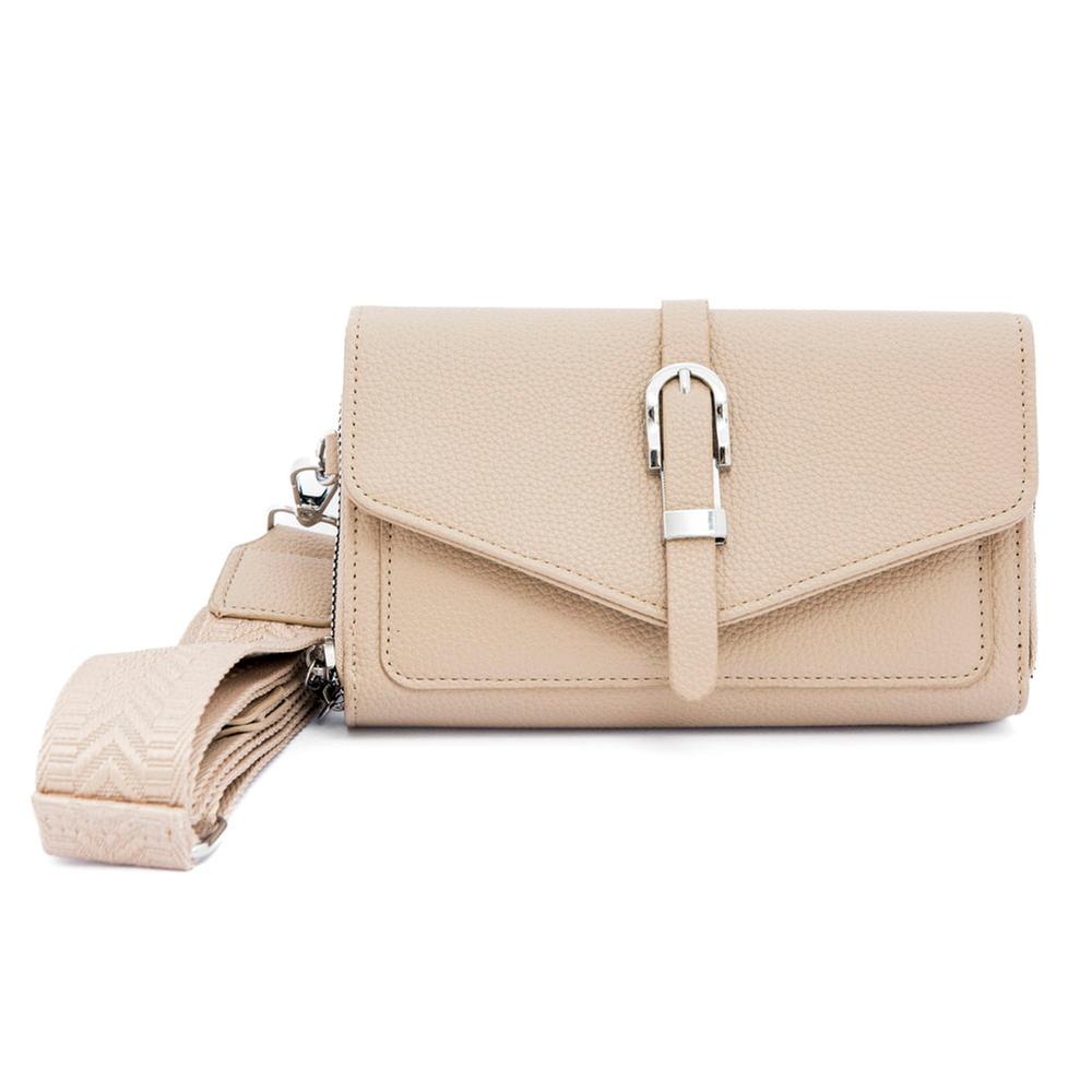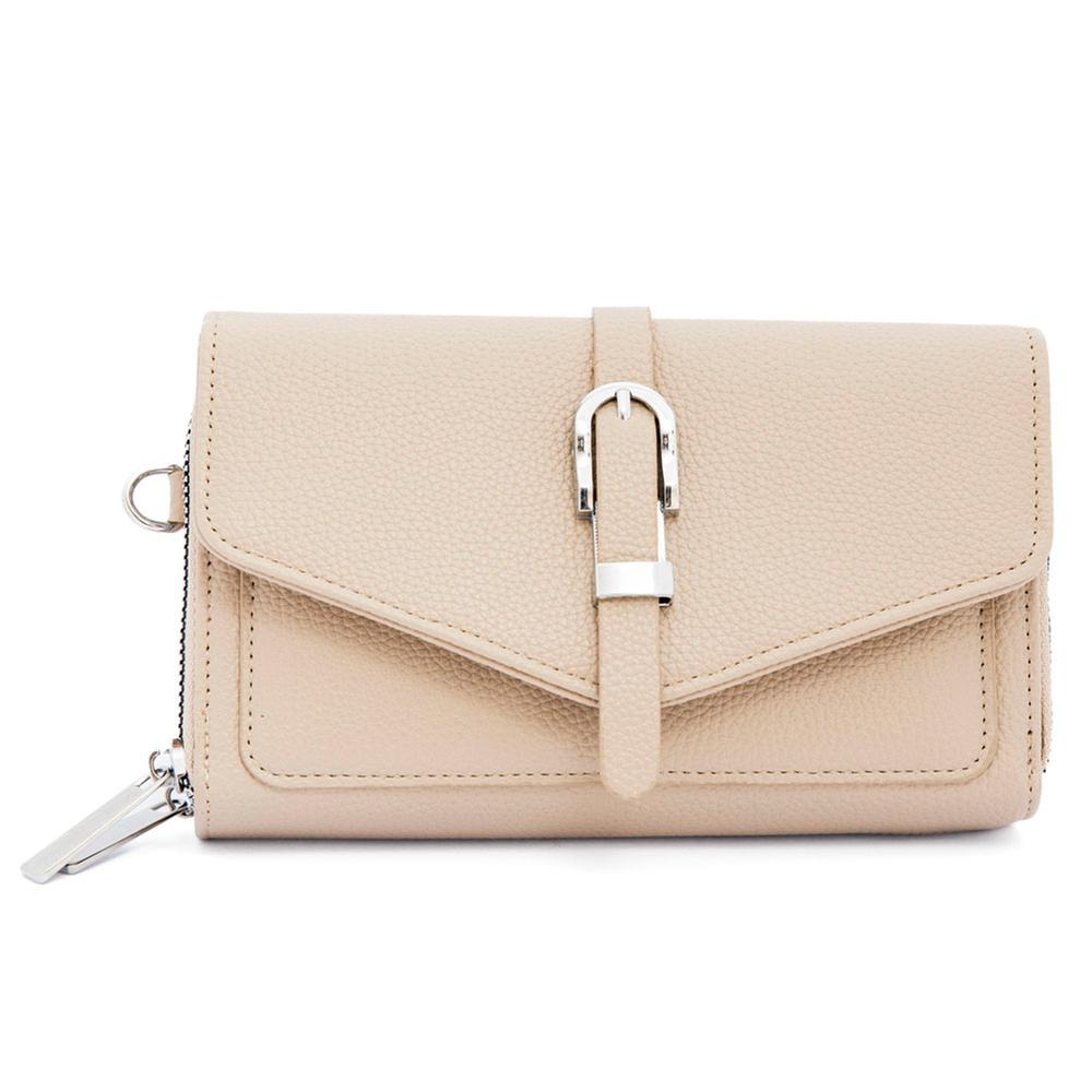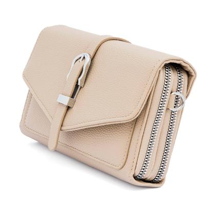 Bolsa beige tipo cartera con hebilla decorativa y compartimentos con cierre, elegante y práctica para el día a día.