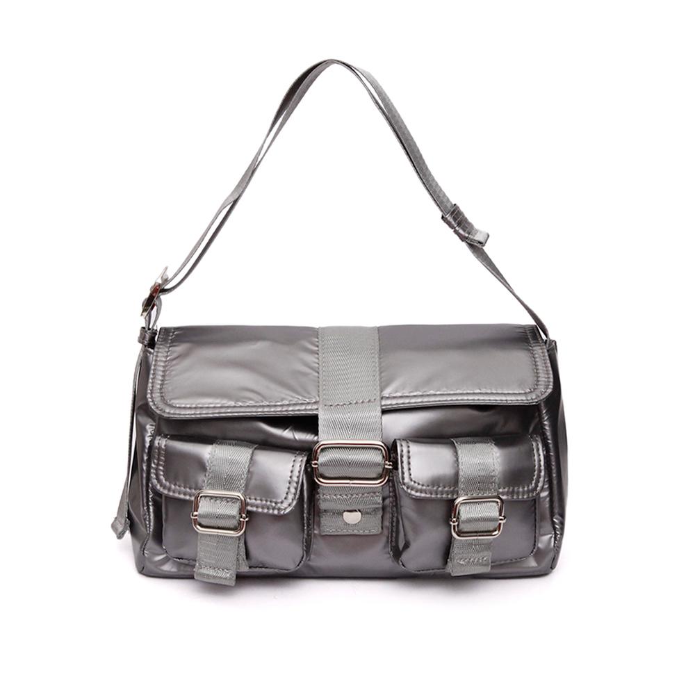 Destaca con un toque futurista gracias a este bolso metalizado. Su correa delgada al hombro y cierre de solapa crean una silueta elegante y moderna, ideal para dar brillo a cualquier look.