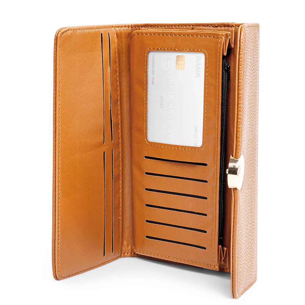Cartera para mujer con un diseño con textura que aporta un toque elegante y moderno, ideal para mantener todo organizado con sus múltiples ranuras para tarjetas y compartimento con zipper para mayor seguridad. El cierre con broche garantiza que tus pertenencias estén siempre protegidas y al alcance de tu mano.