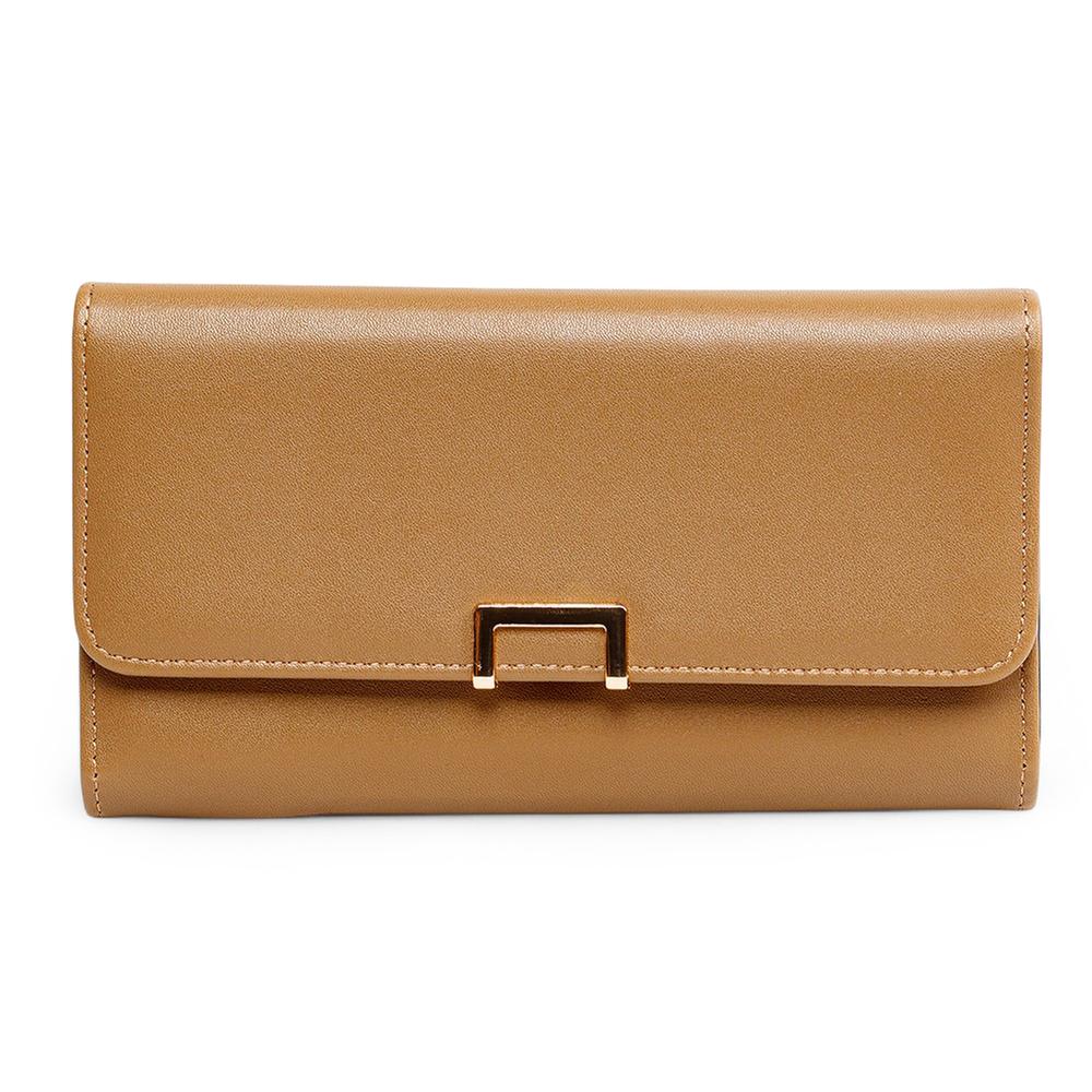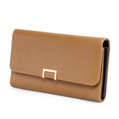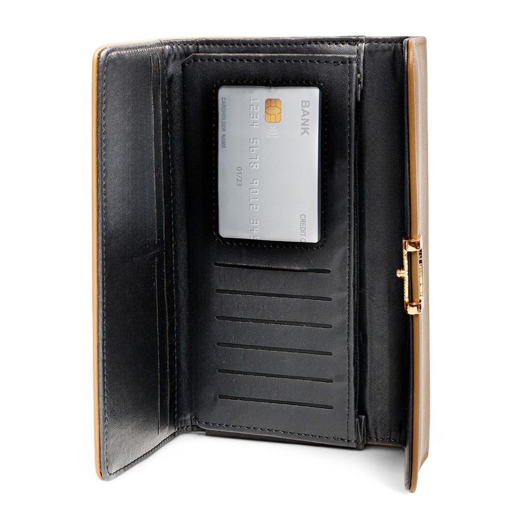 Cartera para mujer con diseño liso y un elegante detalle en contraste que realza su estilo sofisticado, perfecta para mantener tus tarjetas y objetos organizados. Incluye un compartimento con zipper para mayor seguridad y un cierre con broche que facilita el acceso y protege tus pertenencias.