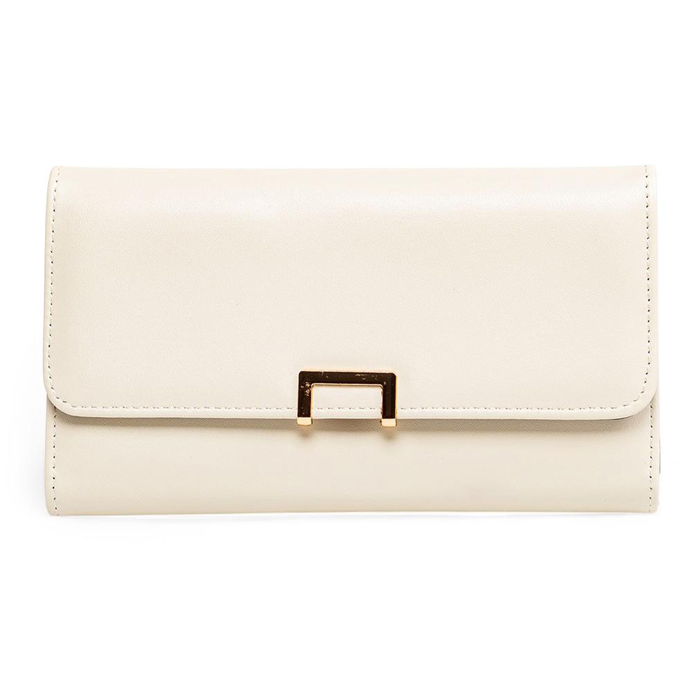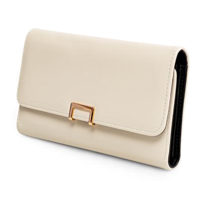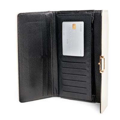 Cartera para mujer con diseño liso y detalle en contraste que le da un toque moderno y elegante, perfecta para organizar tus tarjetas y pertenencias de forma segura. Cuenta con ranuras para tarjetas, compartimento con zipper y cierre con broche que brinda practicidad y protección en cada uso.