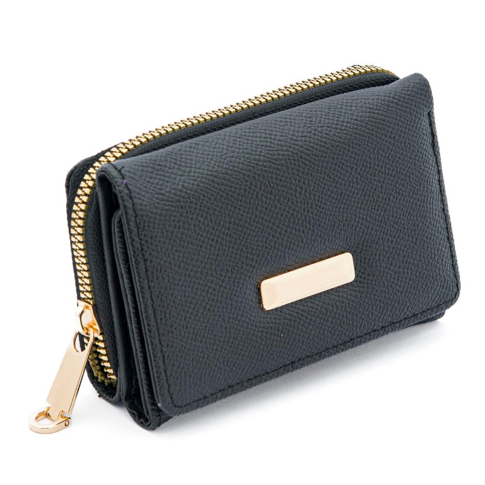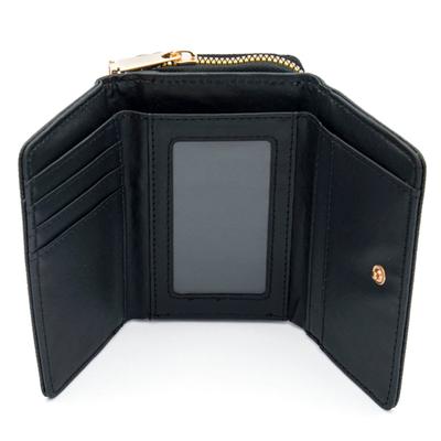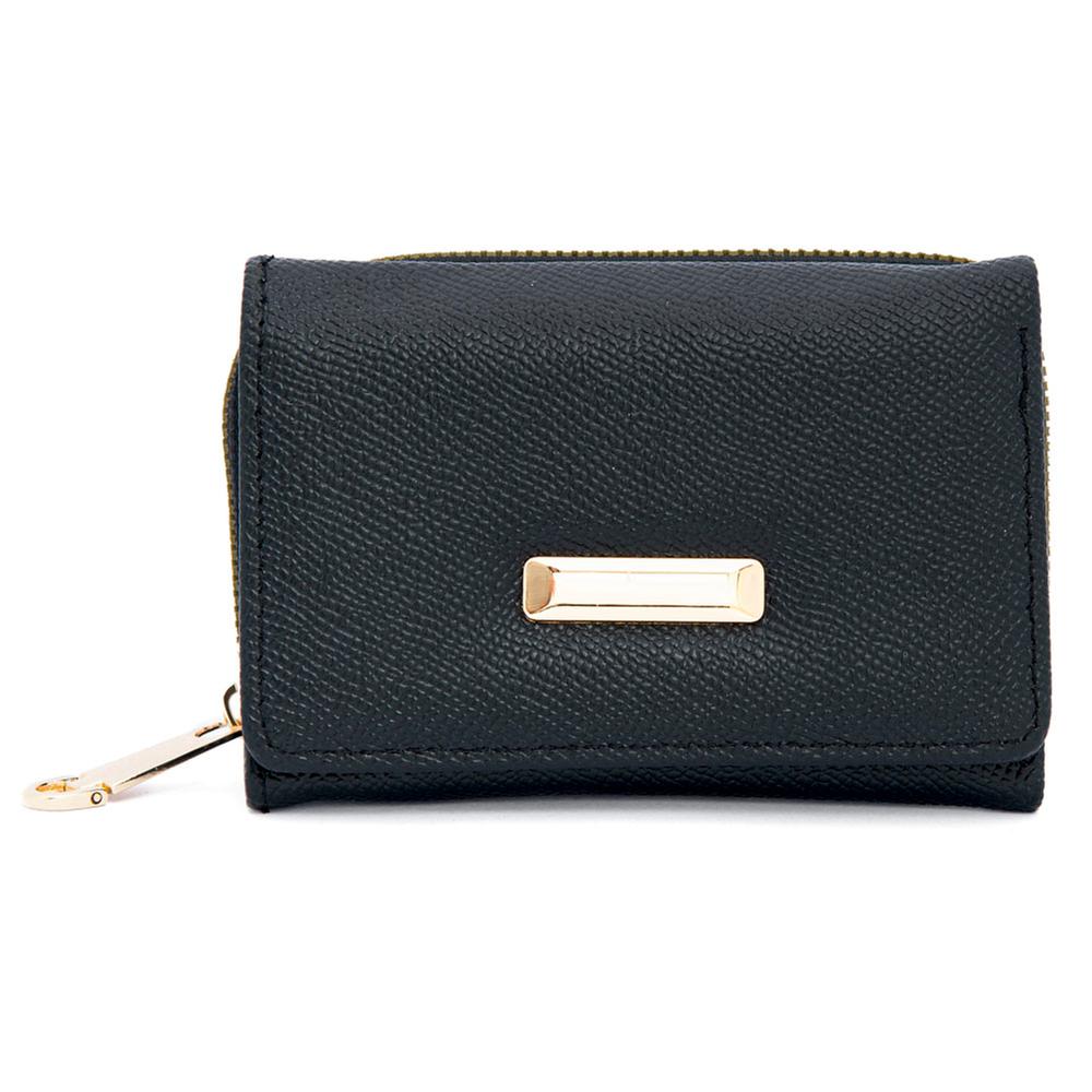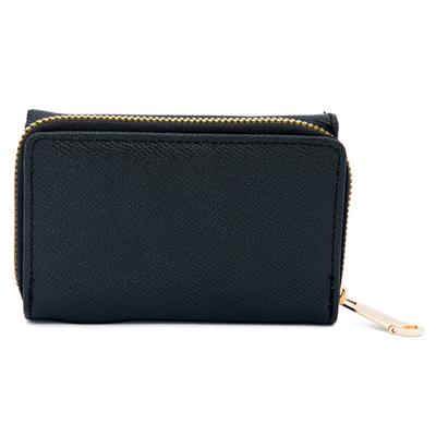Cartera negra con doble compartimento y placa decorativa, elegante y práctica para el uso diario.