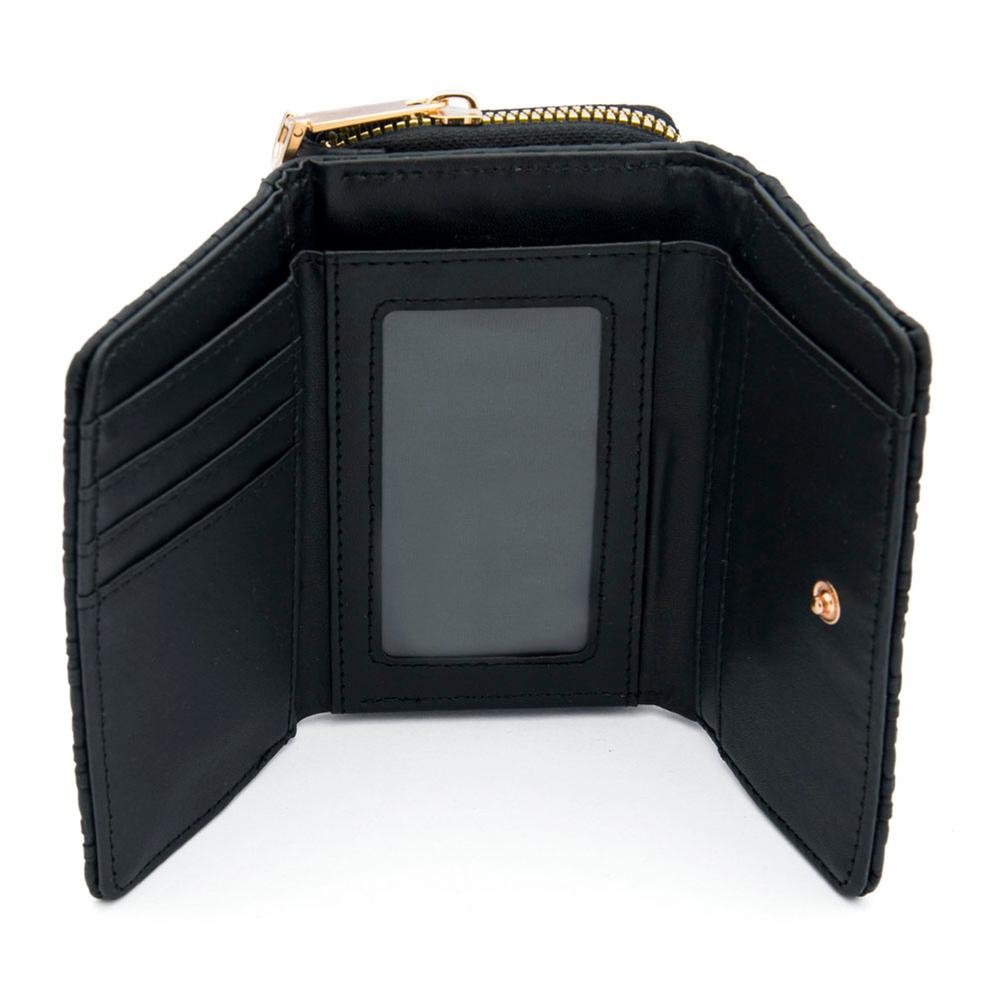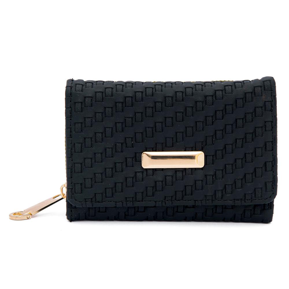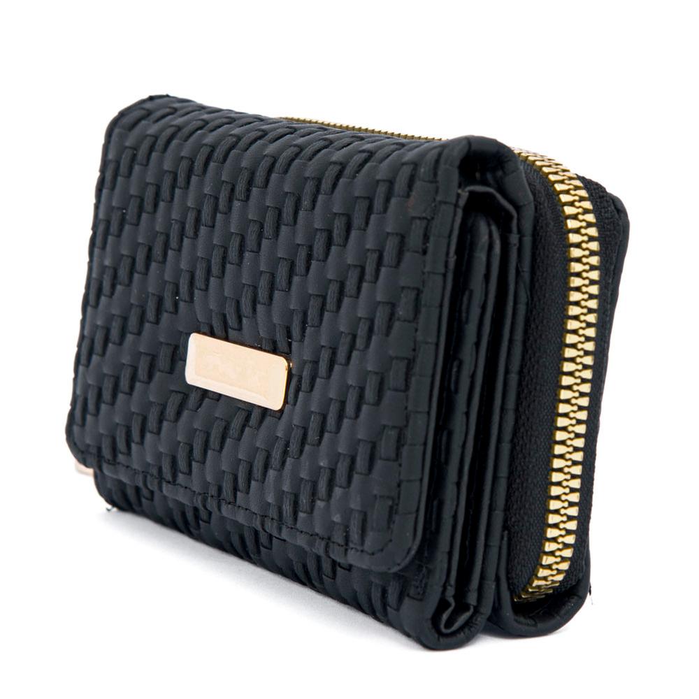 Cartera negra con doble compartimento y detalles metálicos, práctica y elegante para uso diario.