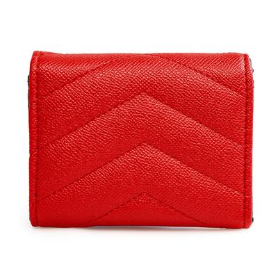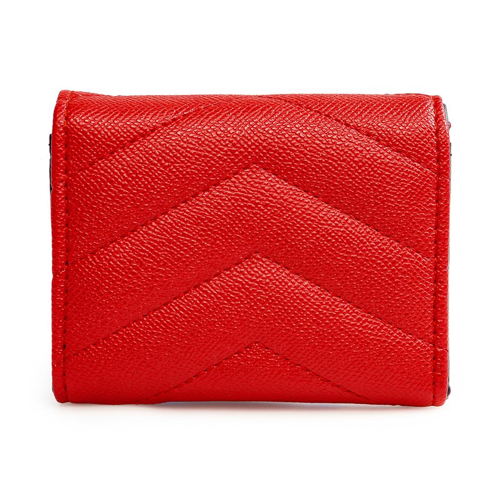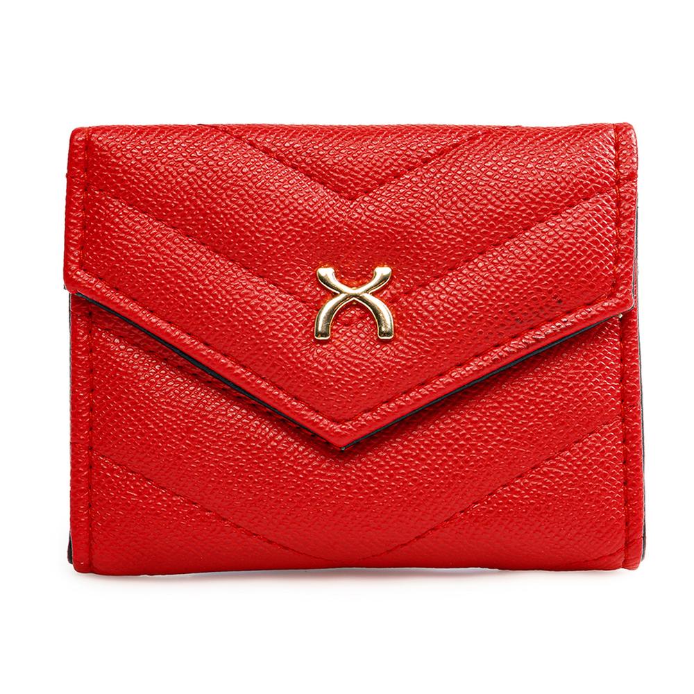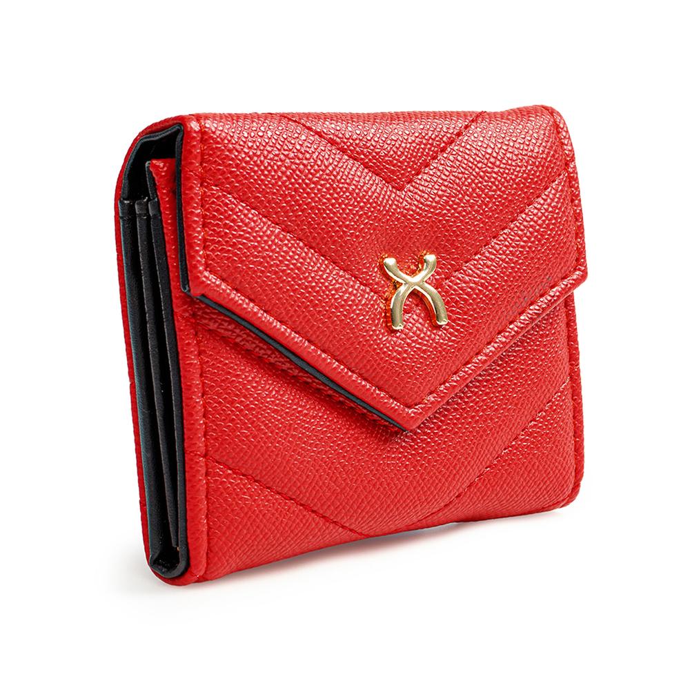 Esta cartera chica en rojo destaca por su diseño liso con costuras finas y una placa decorativa que resalta su estilo clásico y detalles cuidadosos, perfecta para cualquier ocasión.