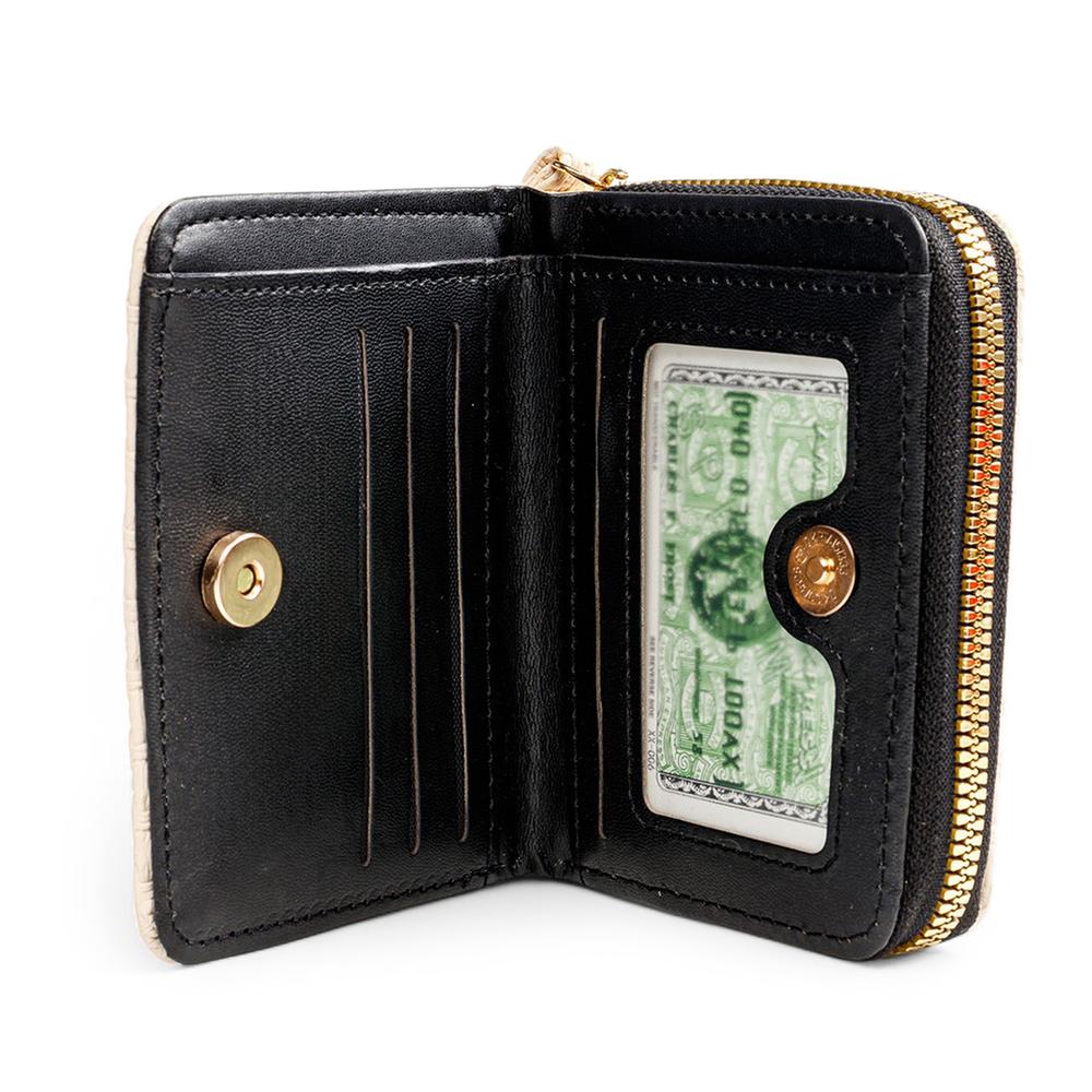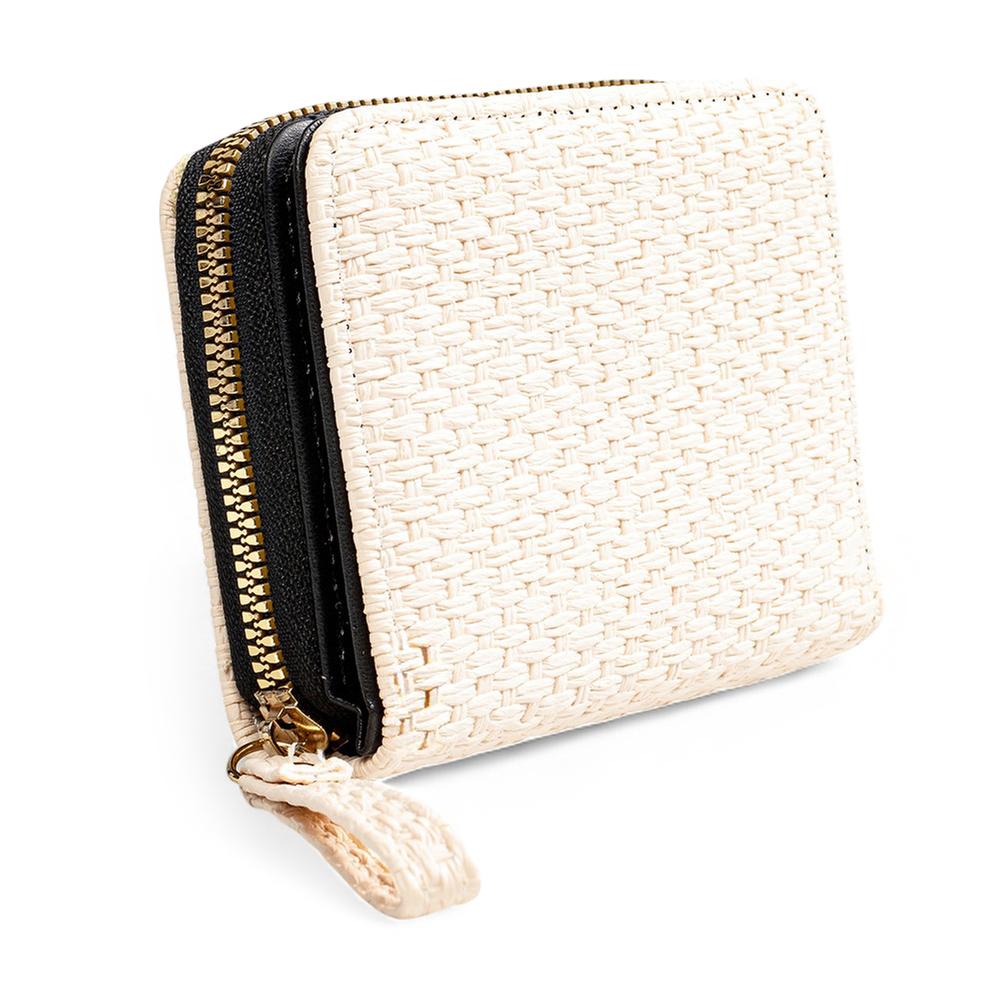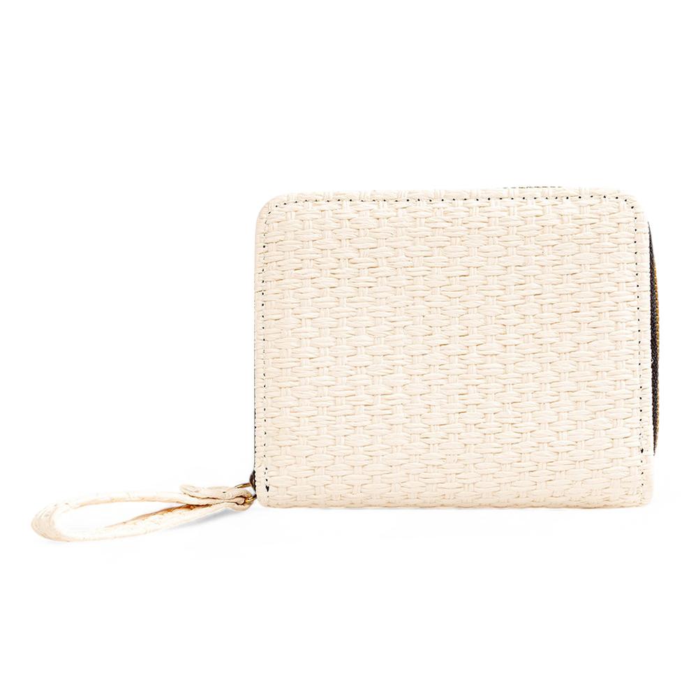 Cartera compacta beige con diseño texturizado, cierre zipper y espacio para tarjetas, ideal para uso diario con estilo sofisticado.