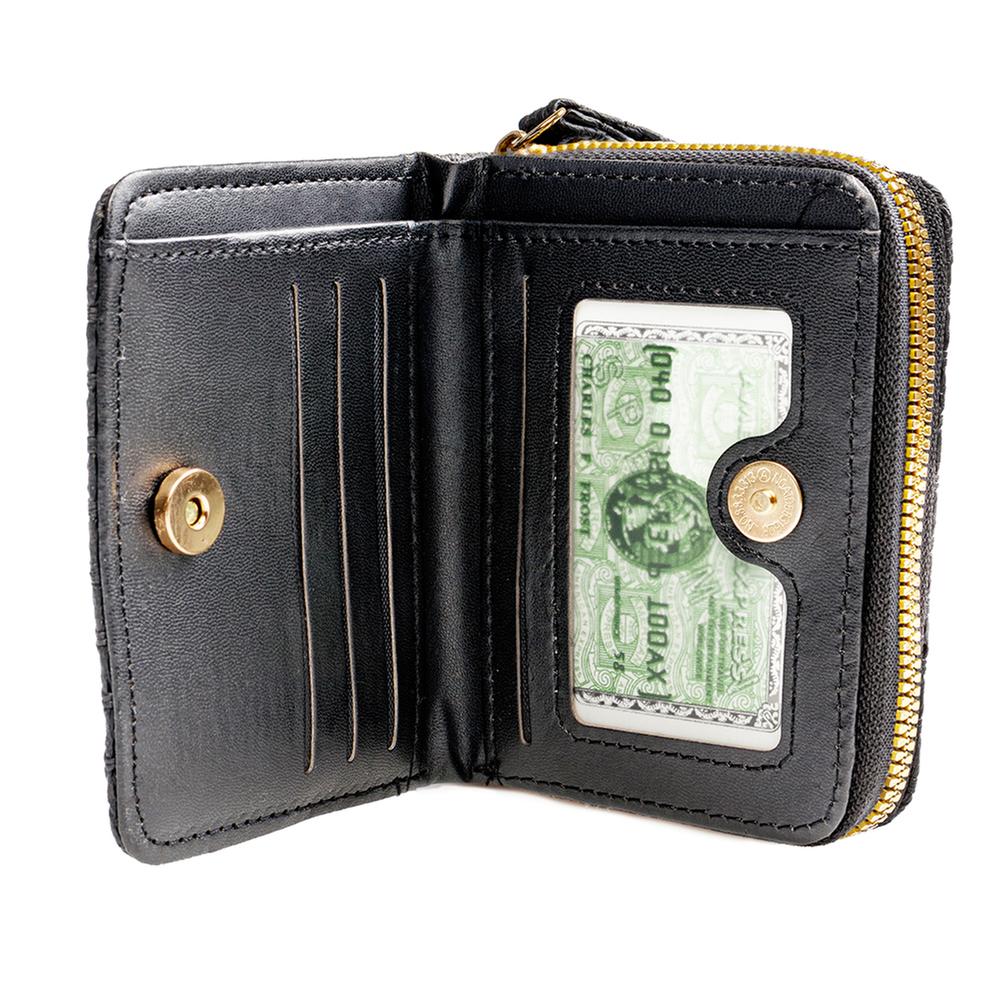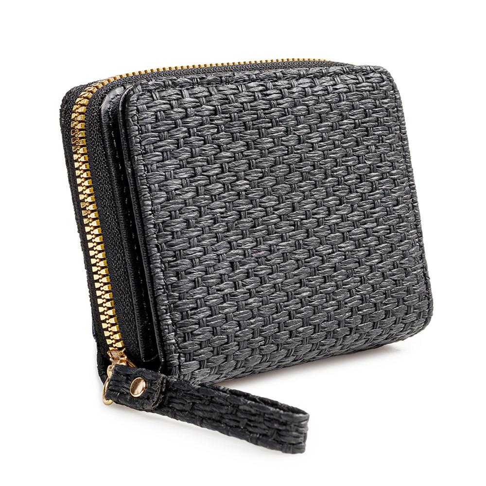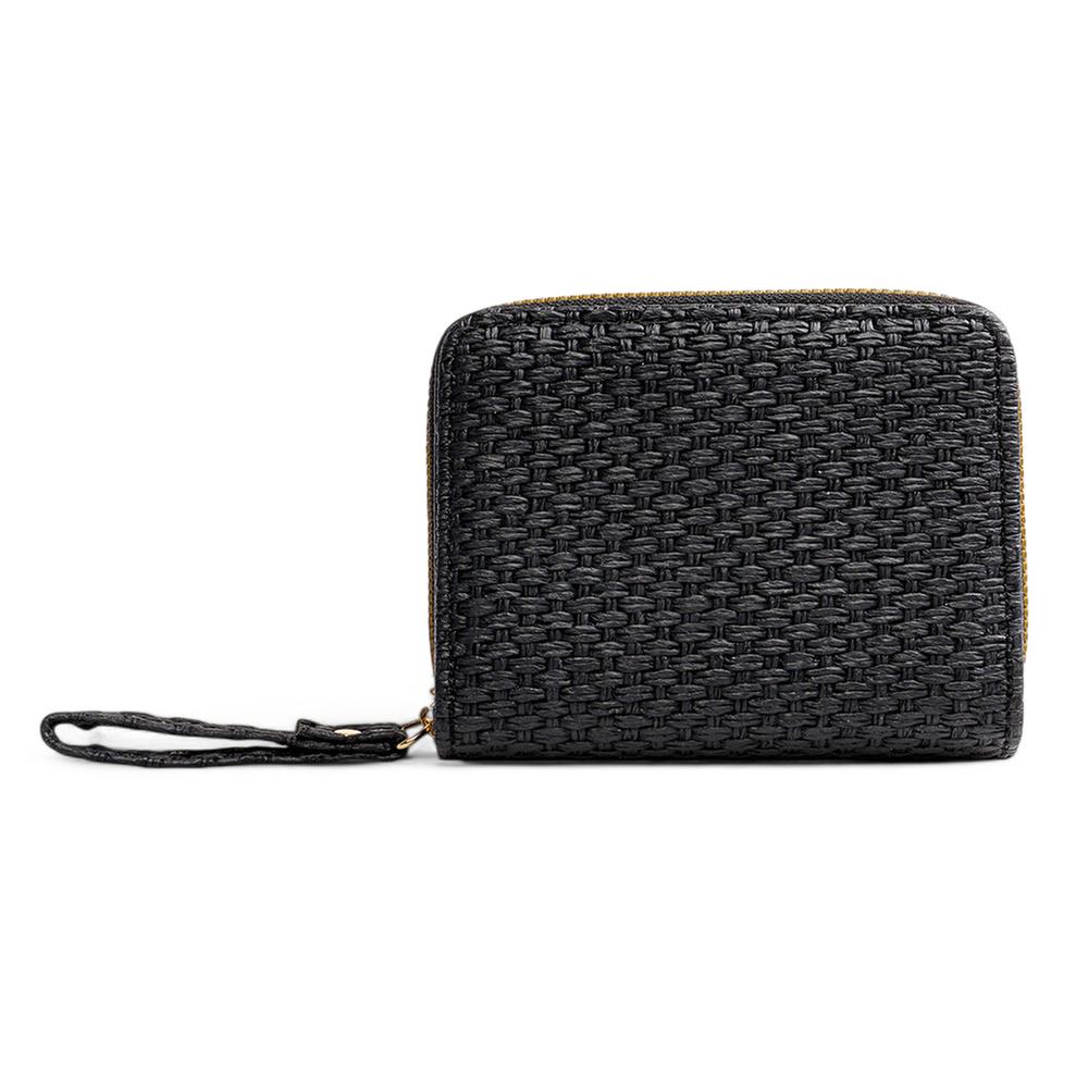 Cartera compacta con textura en color negro, cierre con zipper y ranuras para tarjetas, perfecta para quienes buscan estilo y practicidad.