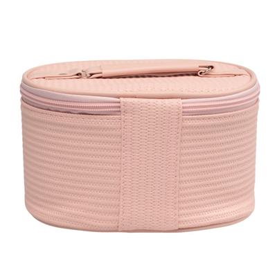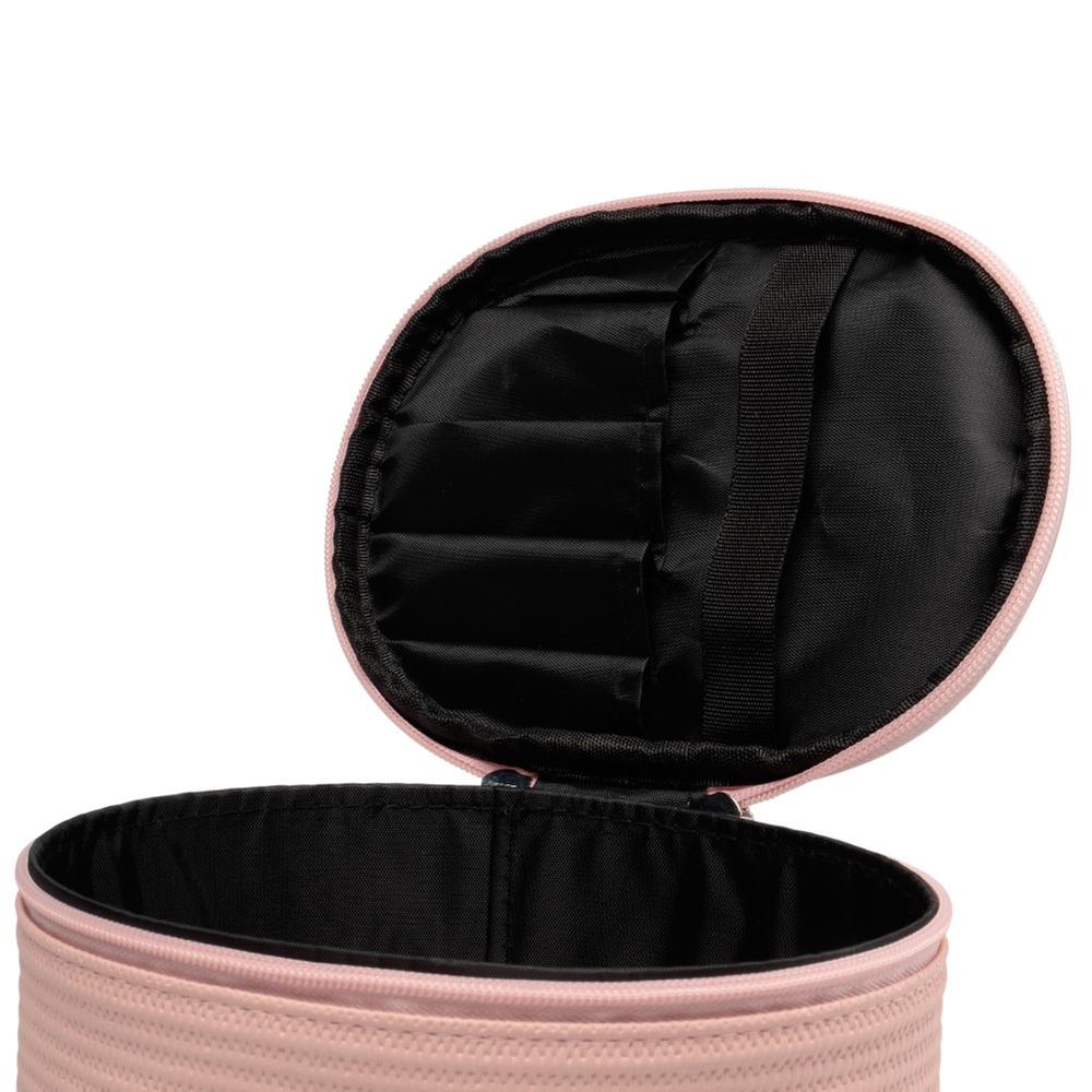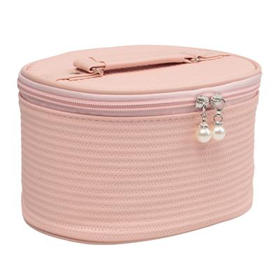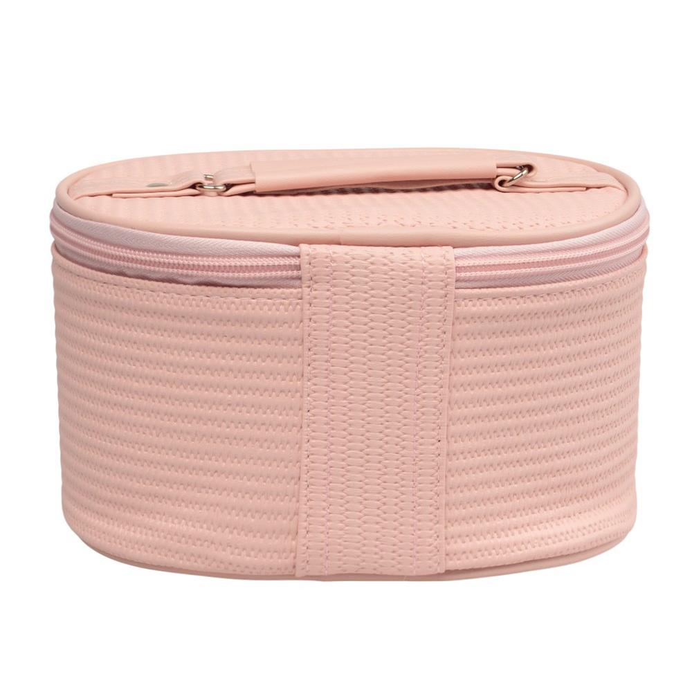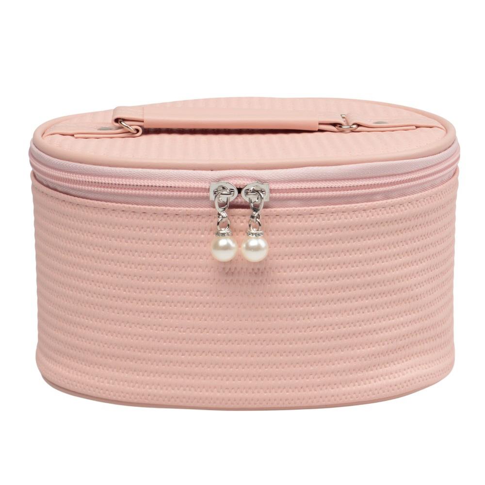 Delicadeza y sofisticación en cada detalle. Con una elegante textura acanalada y una silueta ovalada, esta cosmetiquera se distingue por su cierre decorado con detalles tipo perla. Es la opción más femenina y refinada, ideal para guardar tus artículos de belleza más preciados con total estilo.