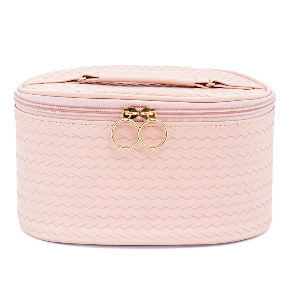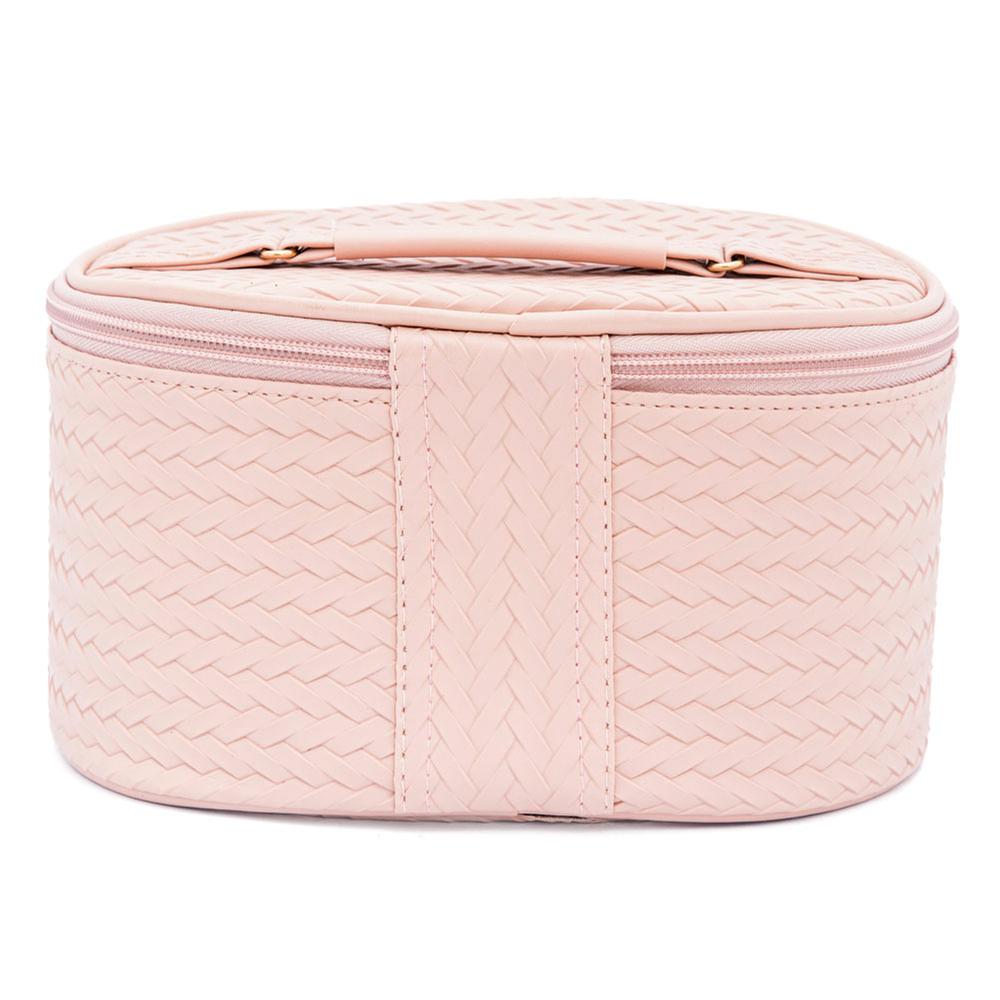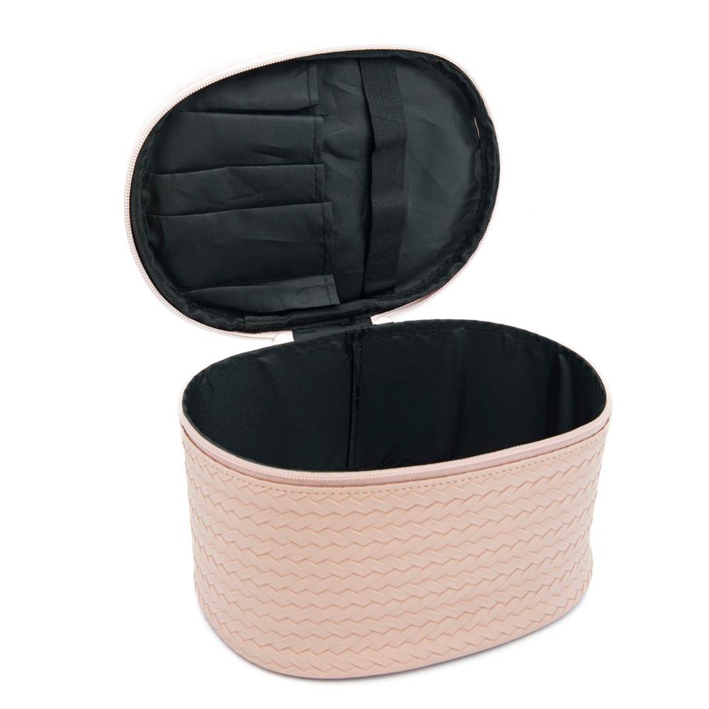 Cosmetiquera ovalada beige con diseño trenzado y asa reforzada, práctica y elegante para organizar tus esenciales.