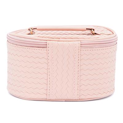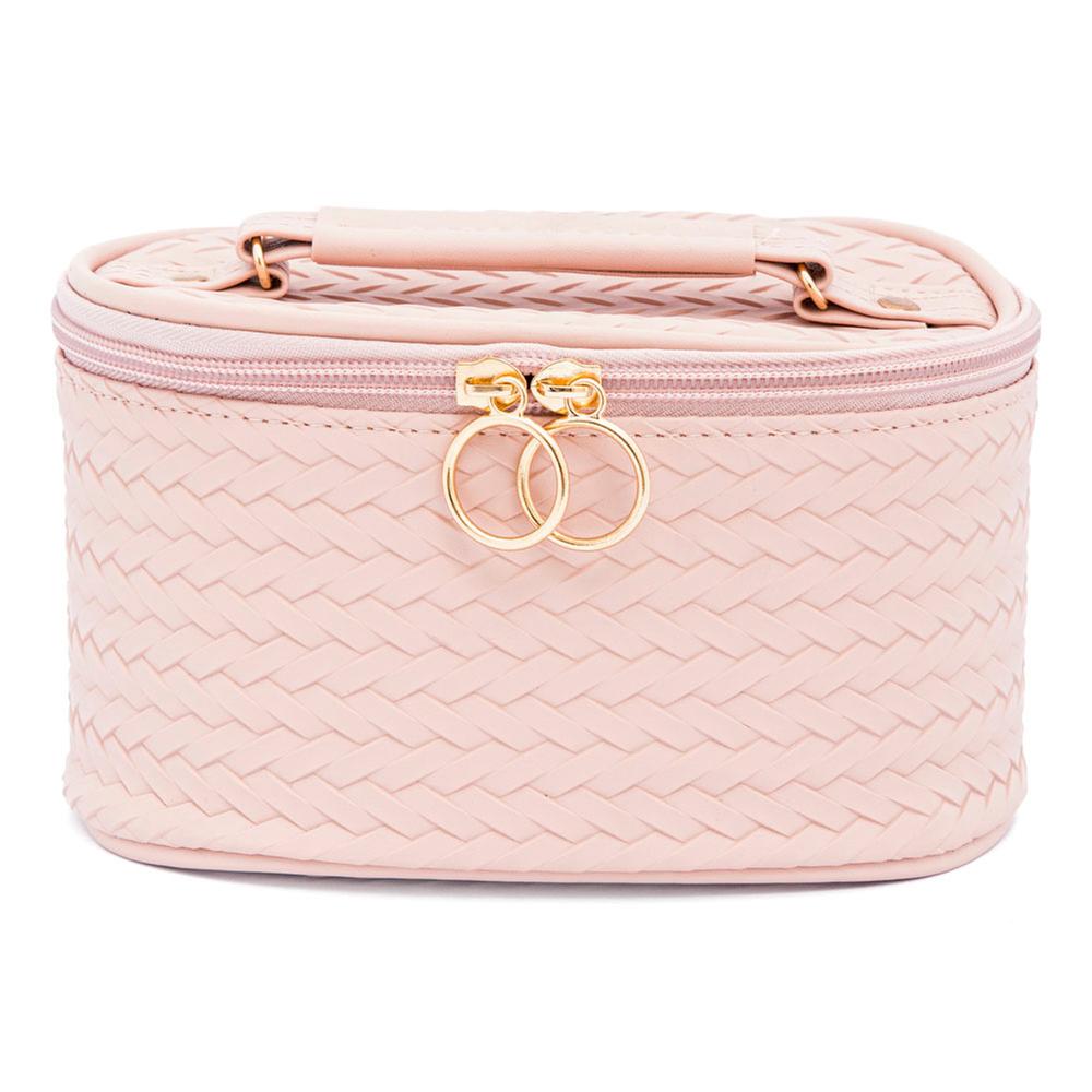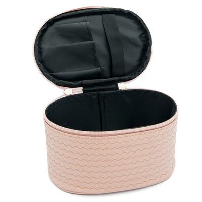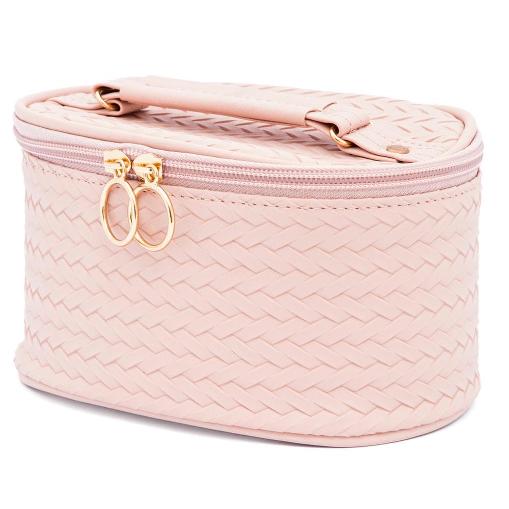 Cosmetiquera ovalada beige con diseño trenzado, elegante y funcional para mantener tus esenciales bien organizados.
