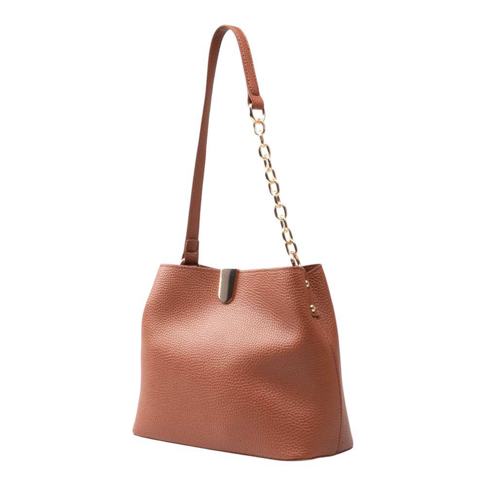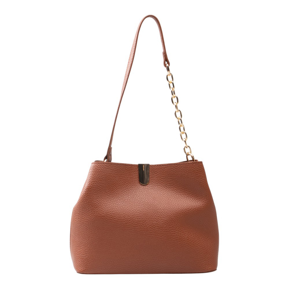 Estilo sofisticado y contemporáneo, esta bolsa en tono camel con cadena es el complemento perfecto para tu outfit.
