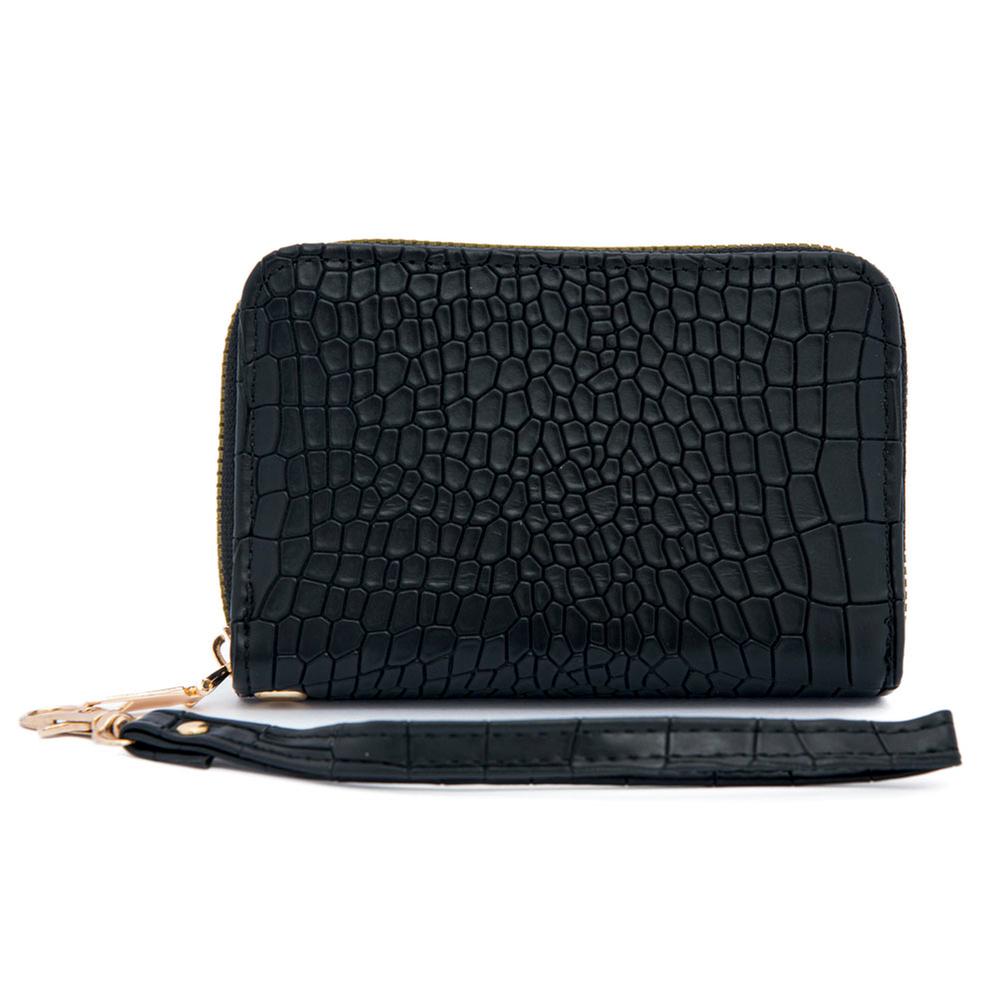 Cartera negra con textura y muñequera desmontable, práctica y moderna para llevar tus esenciales.
