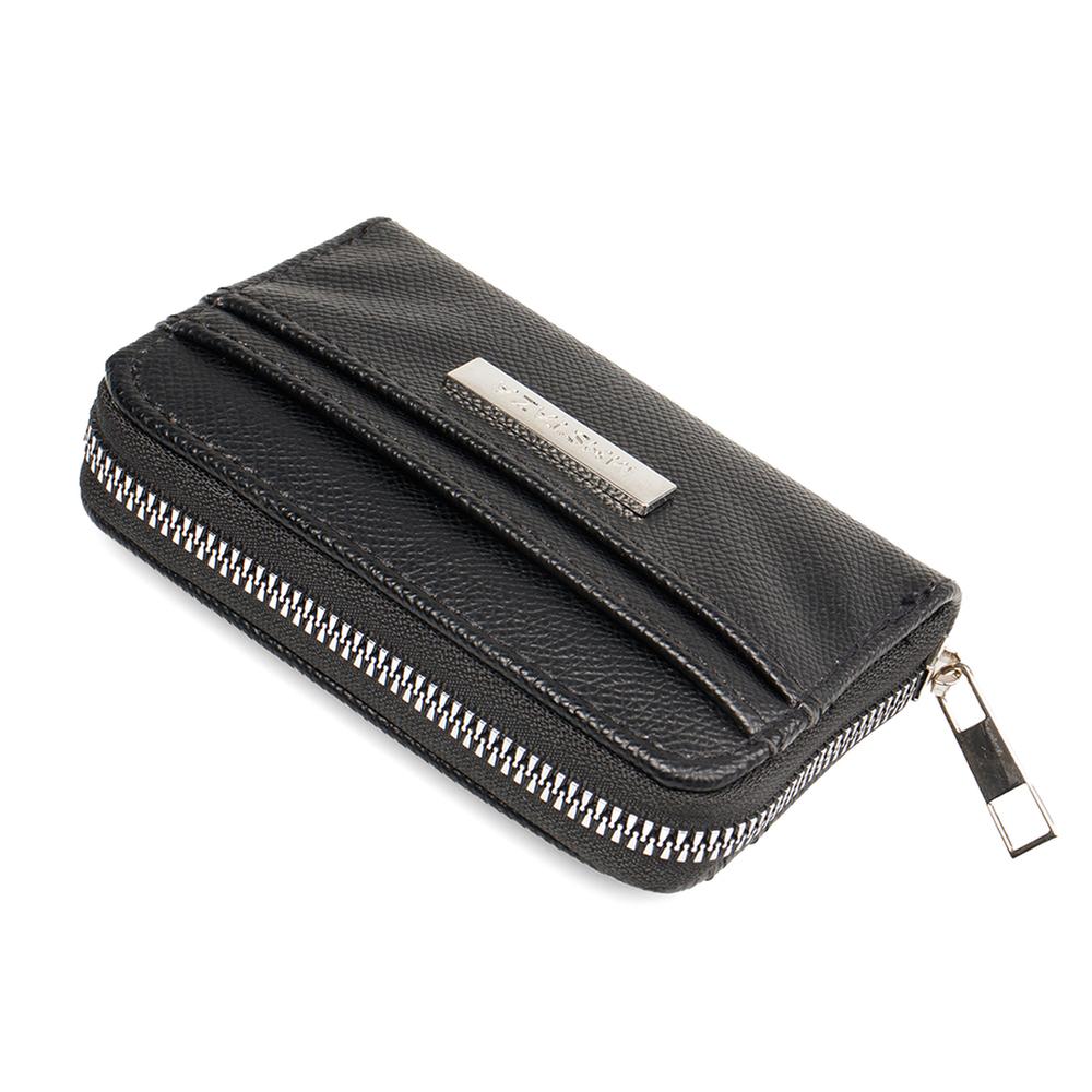 Diseño con textura granulada y tarjetero exterior para fácil acceso. Su placa metálica agrega un toque sofisticado. Perfecta para llevar ligera y ordenada.