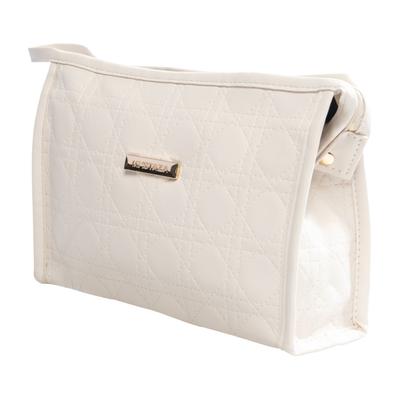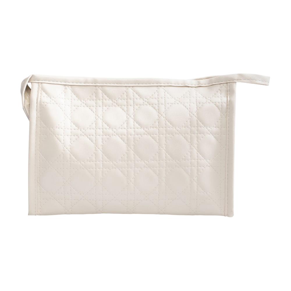 Cosmética con diseño cosido en beige, gran compartimento con zipper, ideal para organizar productos con estilo elegante y práctico.