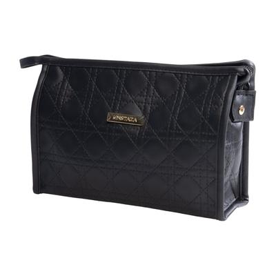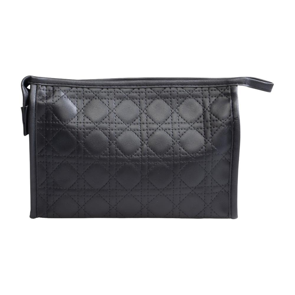 Cosmética con diseño cosido en negro, gran compartimento con zipper, perfecta para guardar productos con estilo y funcionalidad.