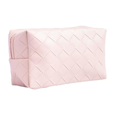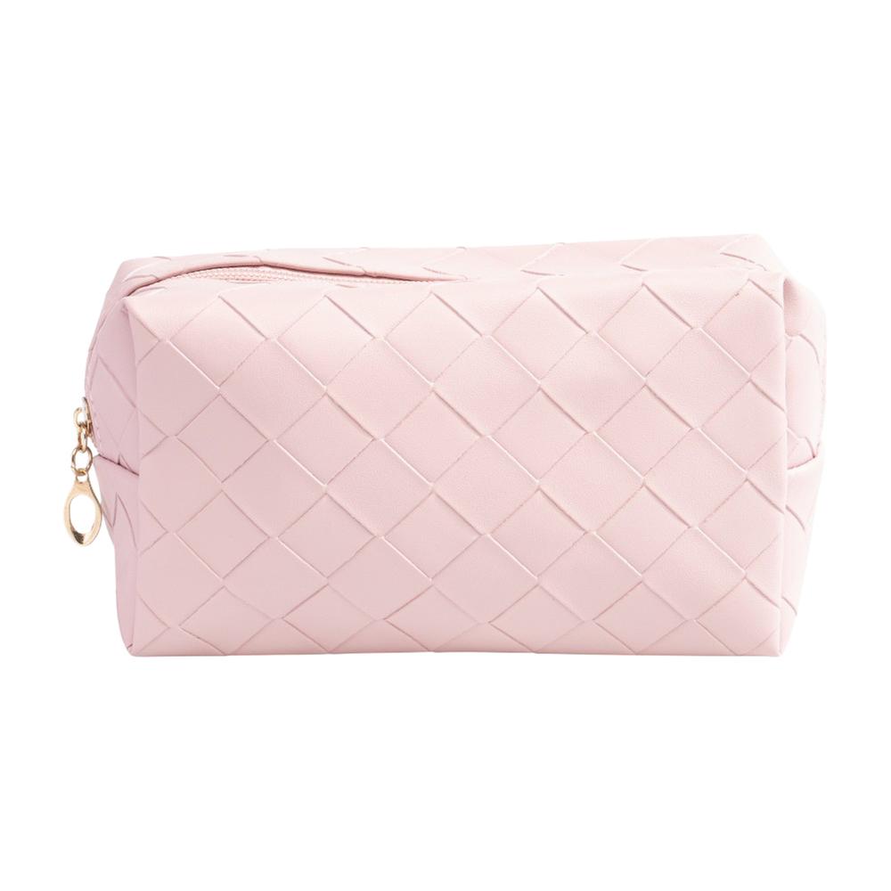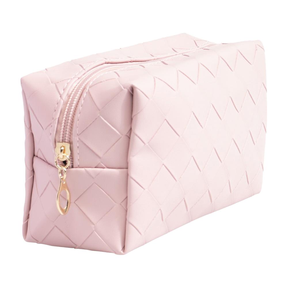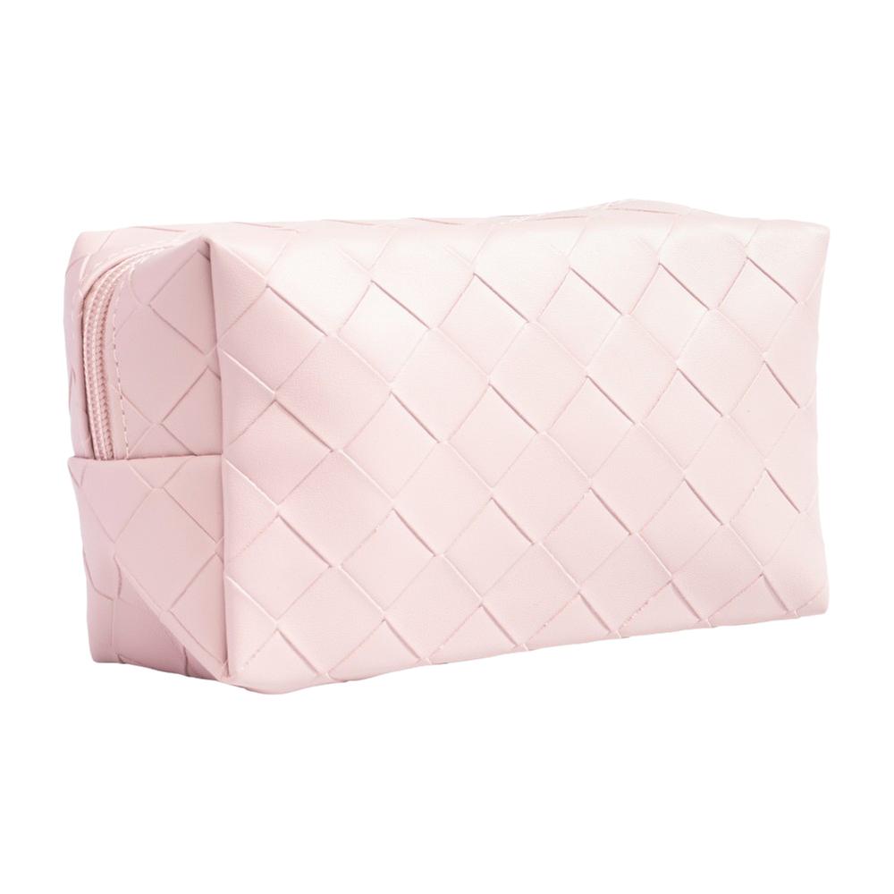 Cosmética cuadrada en rosa claro con textura, amplio compartimento con zipper para organizar productos con un toque femenino y moderno.