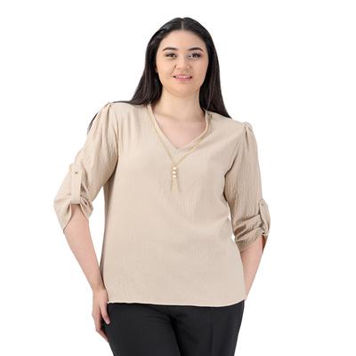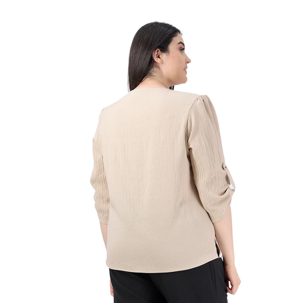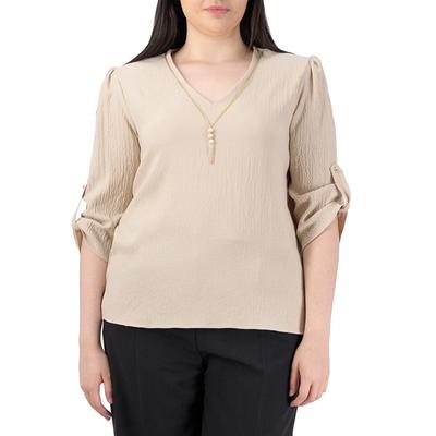 Minimalismo elegante. Una pieza de diseño liso con escote en V que se ve realzada por un collar decorativo integrado. Sus mangas 3/4 con ajuste permiten personalizar el largo para mayor versatilidad