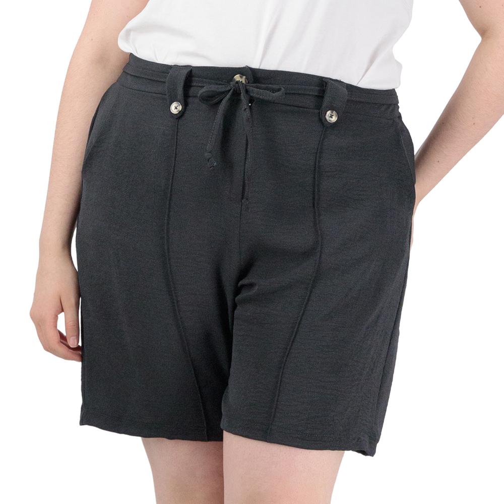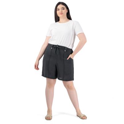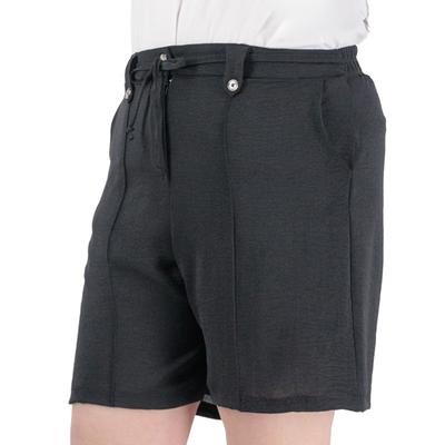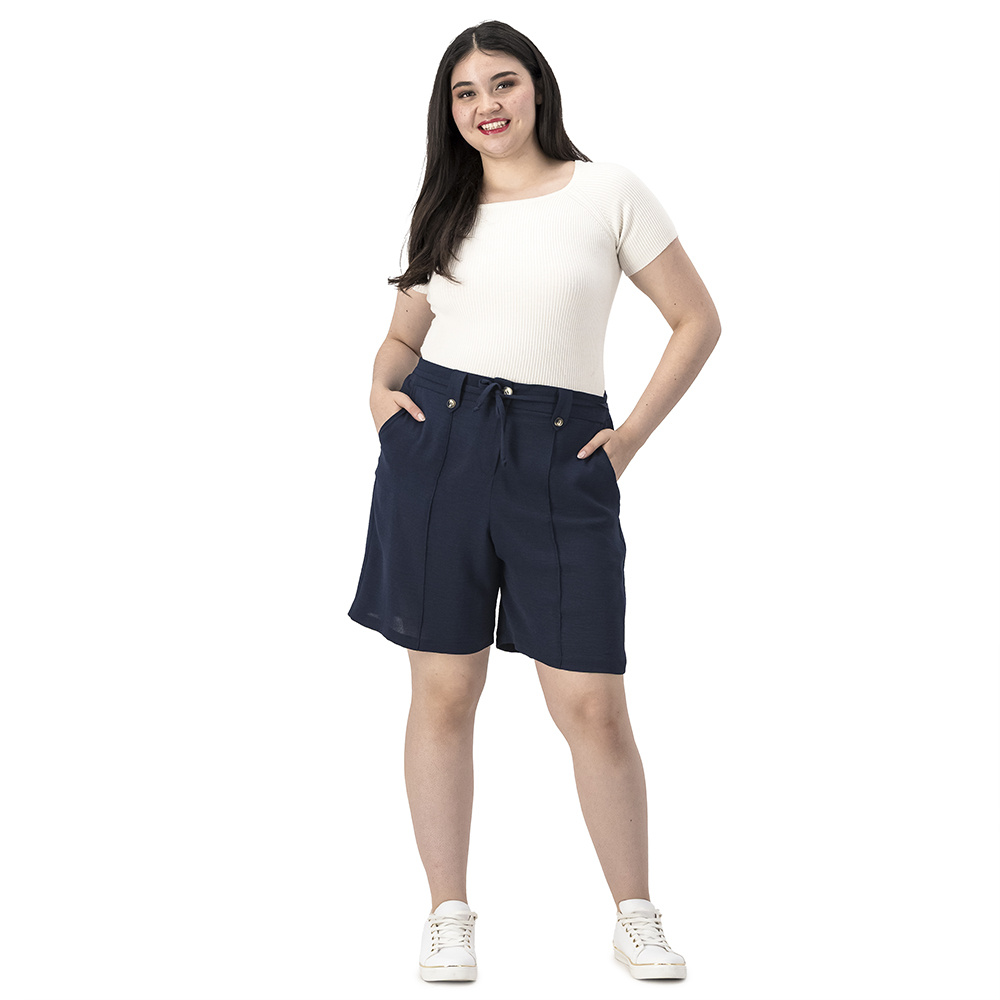 Femenino y moderno. Este short de cintura alta con elástico y jareta destaca por sus botones decorativos en los costados, creando un equilibrio perfecto entre la comodidad y un diseño detallado.