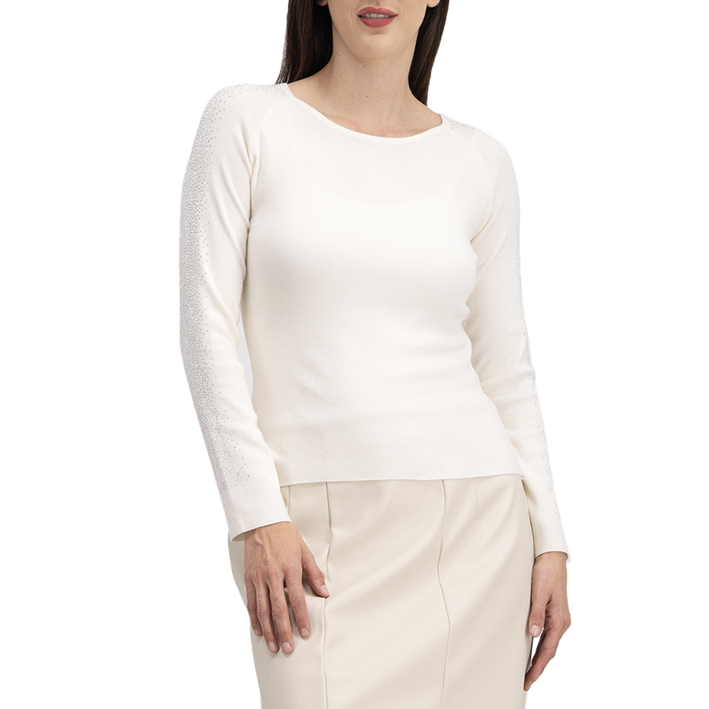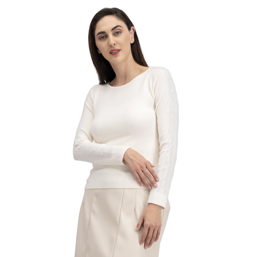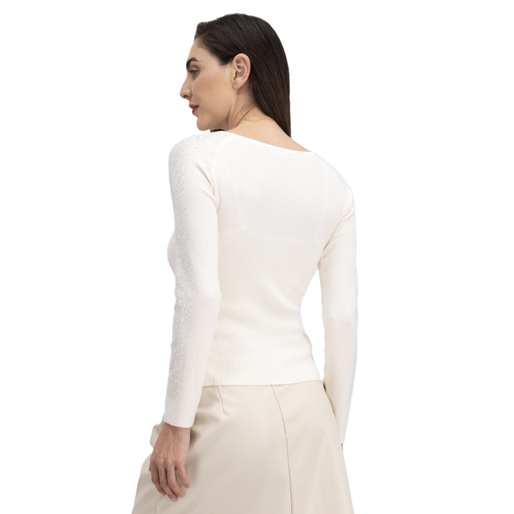 Este suéter aporta un estilo único gracias a sus delicadas aplicaciones que realzan su diseño, convirtiéndolo en una prenda encantadora y versátil. Suave, cálido y con un toque distintivo, es perfecto para elevar cualquier atuendo cotidiano.