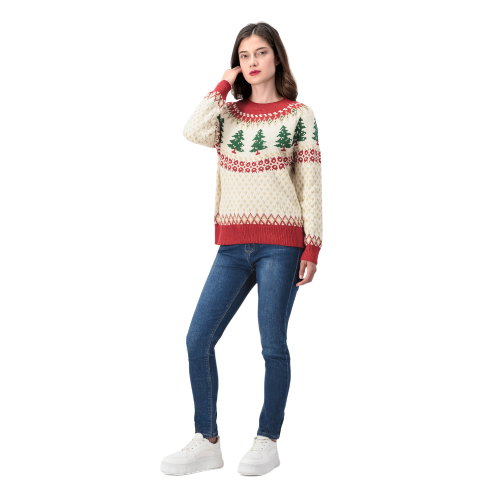 Disfruta de la temporada navideña con este suéter ultrasuave. Su cuello redondo clásico y los detalles de árboles al contraste realzan el diseño festivo y te mantendrán cómoda y a la moda.