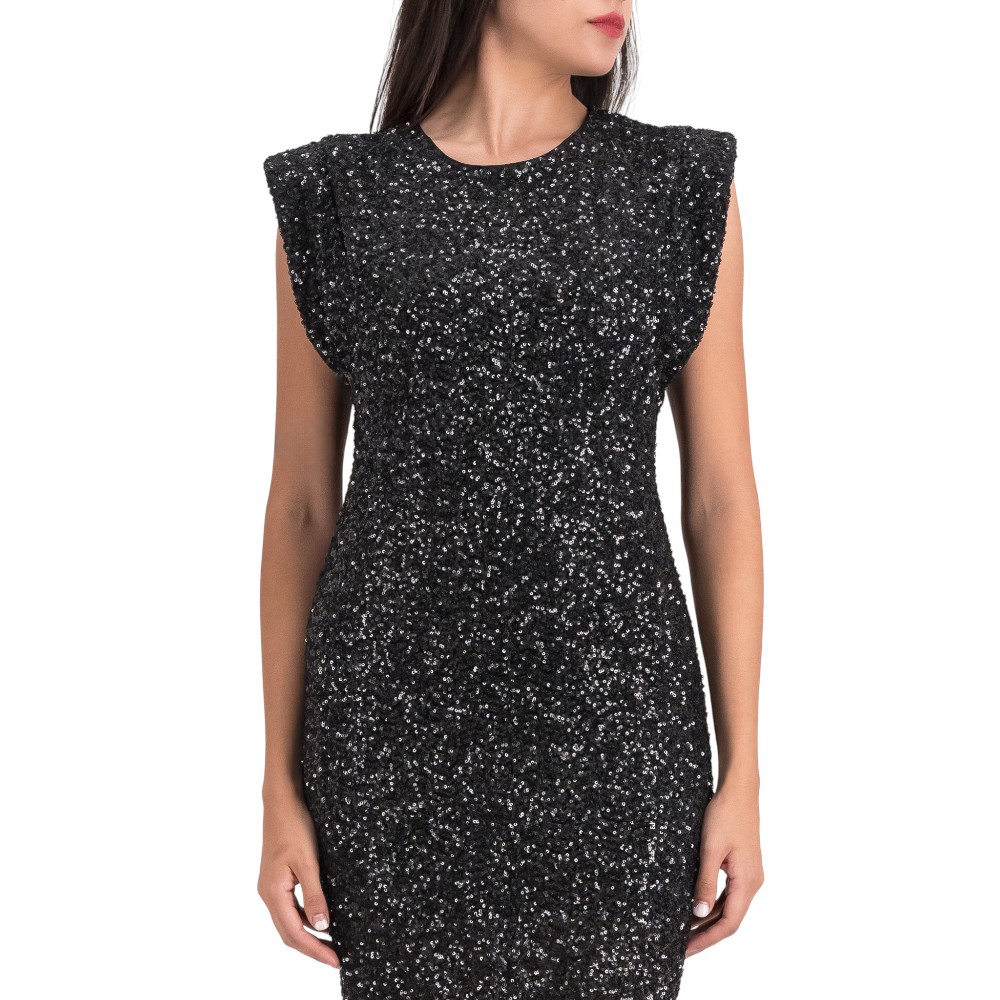 Brilla en cualquier ocasión con este vestido de lentejuela de acabado liso y elegante. Su cuello redondo y corte sin mangas estilizan la figura, mientras que su largo a la rodilla aporta un toque sofisticado. Ideal para fiestas y eventos especiales.