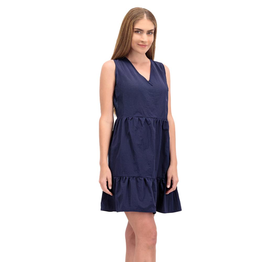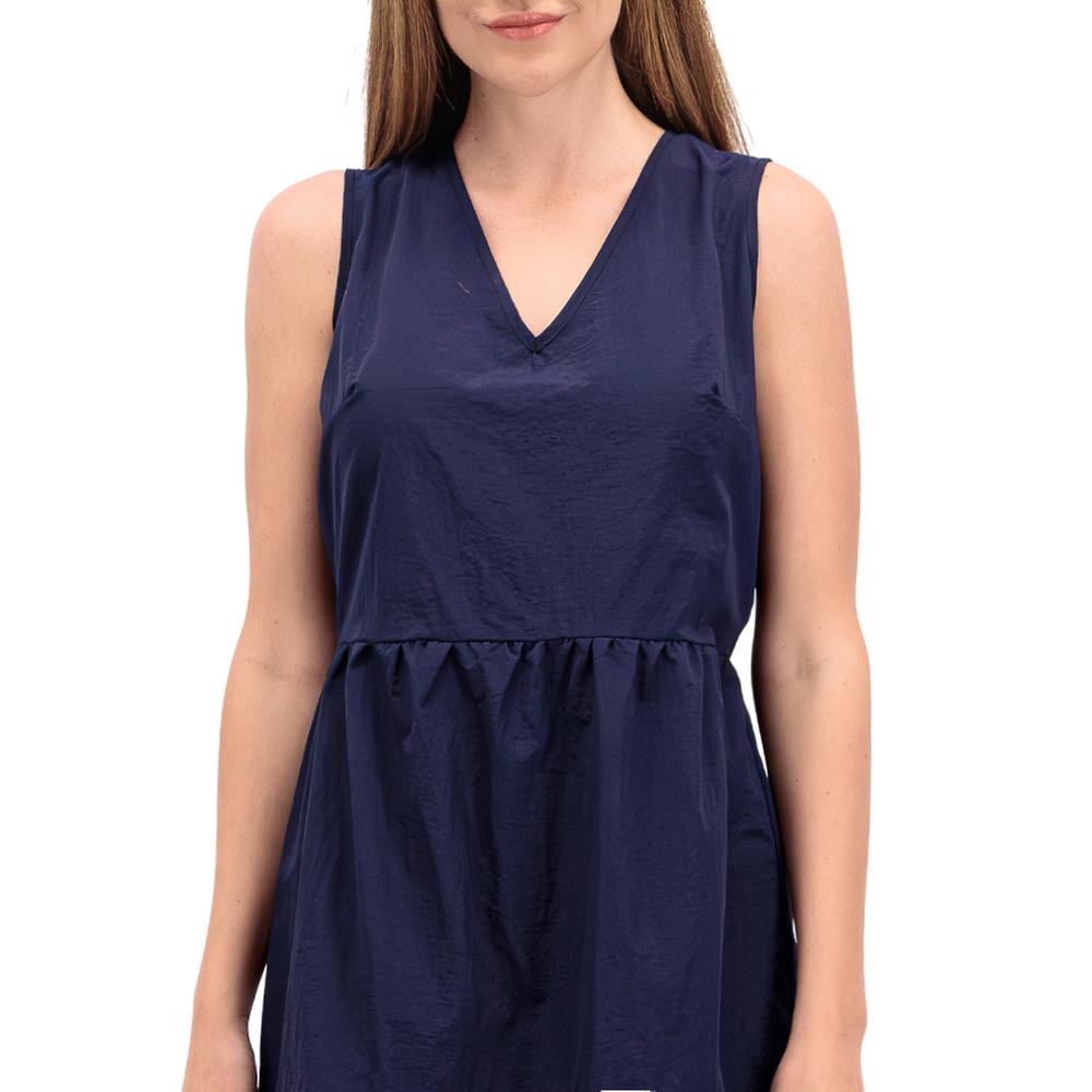 Frescura y estilo se unen en este diseño. Con un favorecedor escote en V y un detalle fruncido que realza la silueta, este vestido sin mangas es la opción ideal para lucir radiante en los días de sol.