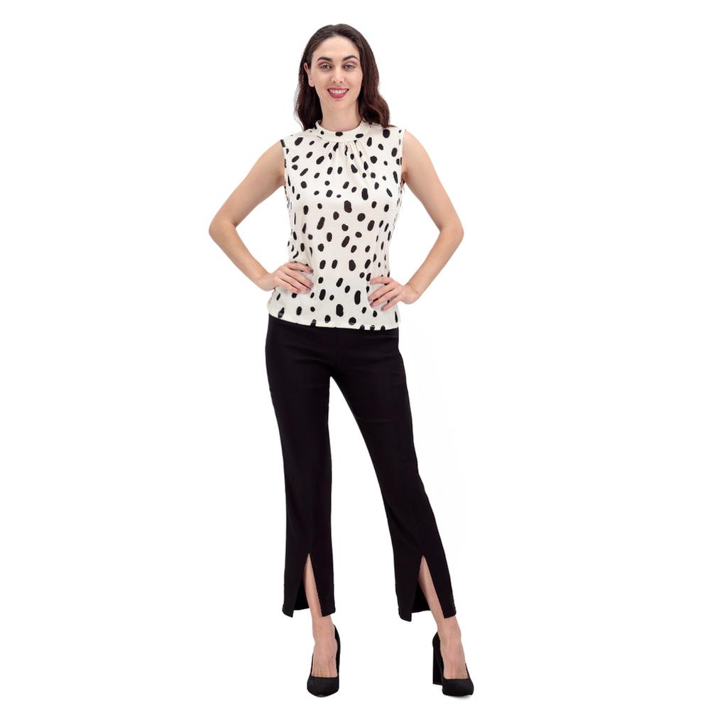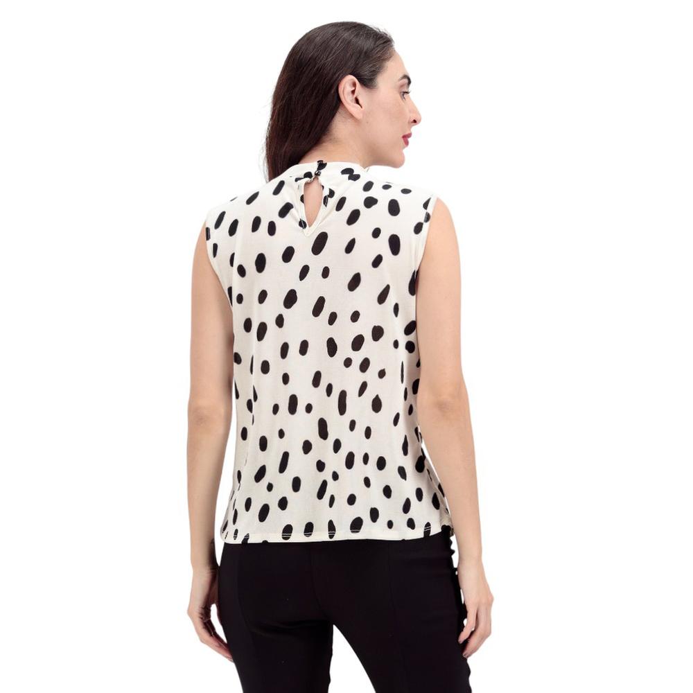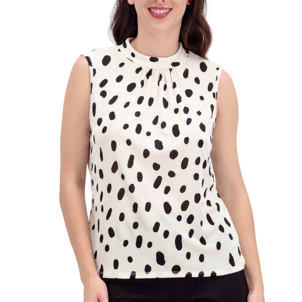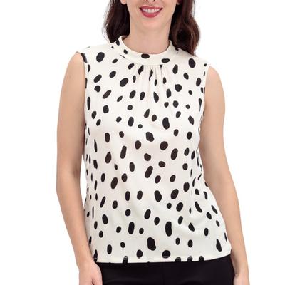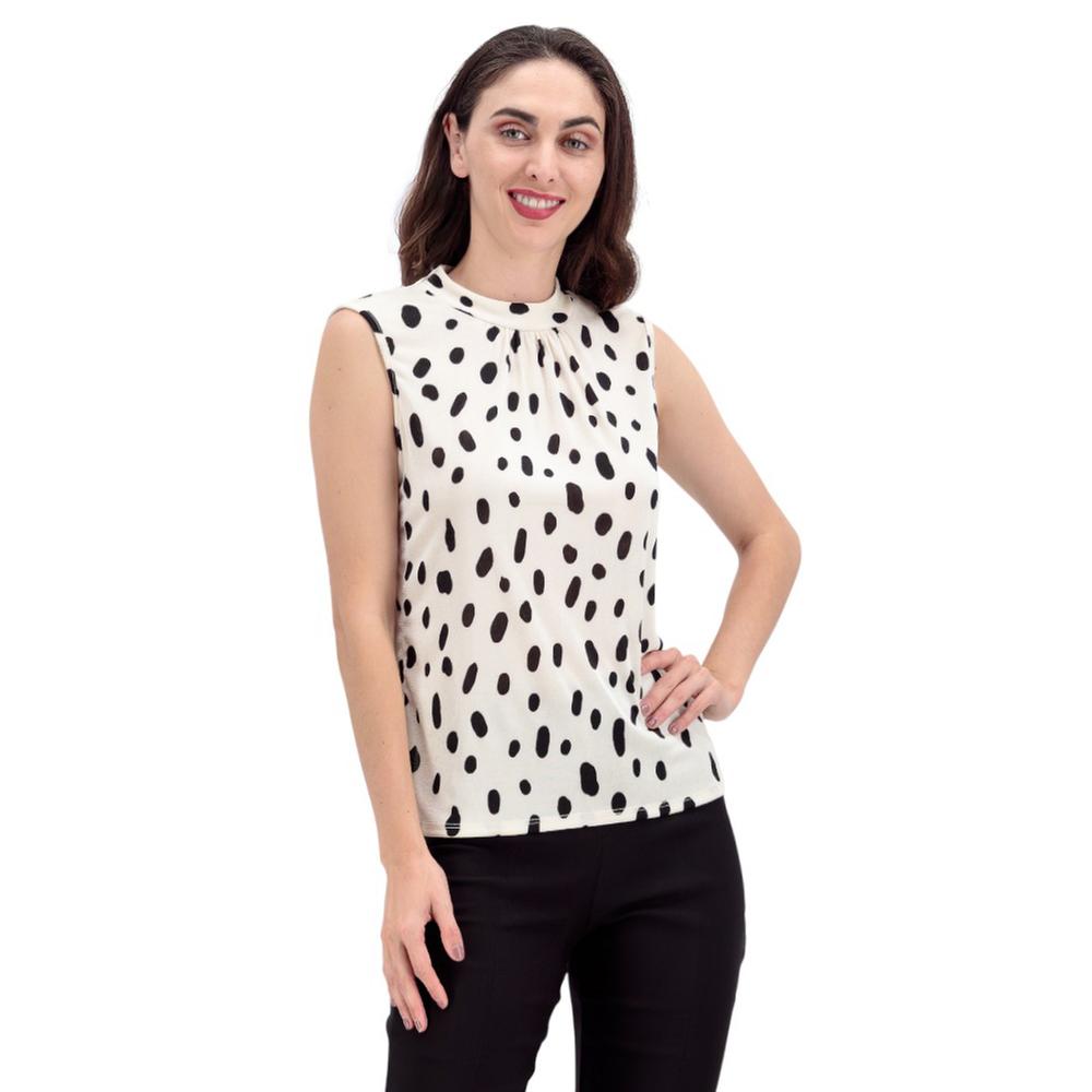 Encanto retro y juguetón. Esta blusa es un deleite visual con su diseño de lunares y un delicado cuello fruncido. Al ser sin mangas, es perfecta para esos días cálidos donde quieres lucir fresca y chic.
