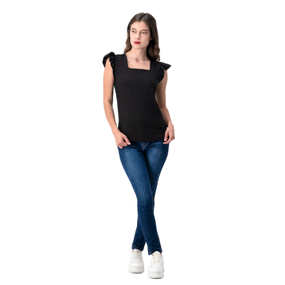 Dale un giro a tu look con esta blusa única. Su cuello cuadrado asegura un ajuste cómodo, mientras que el diseño con olanes en los hombros la convierte en una pieza diferente y femenina. Perfecta para un estilo casual.