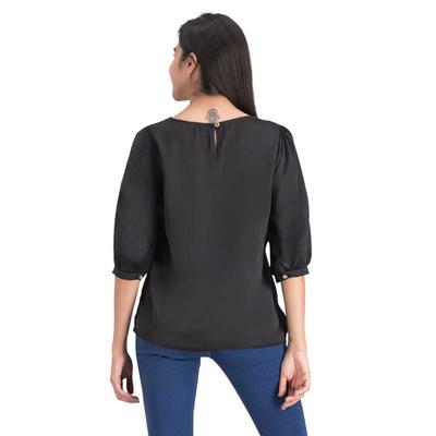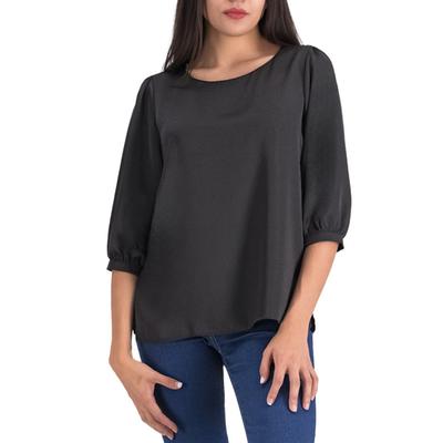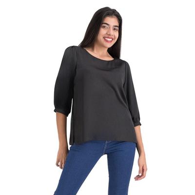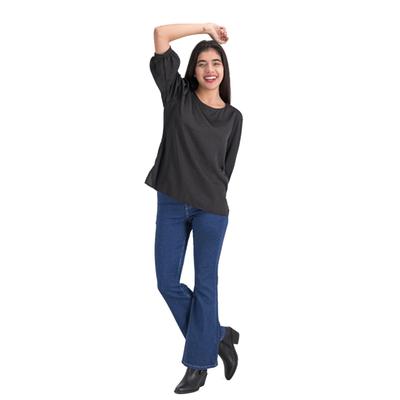 Aporta frescura y estilo con esta blusa de manga 3/4 y diseño holgado. Su ajuste en mangas y cuello redondo la hacen ideal para looks cómodos y versátiles.