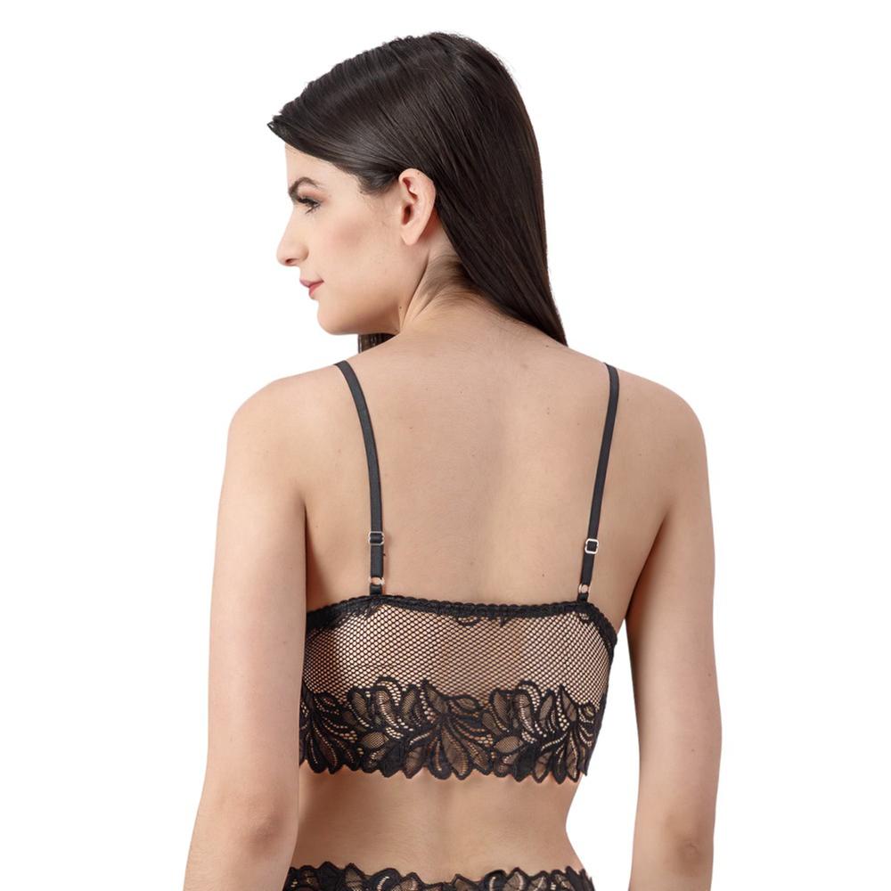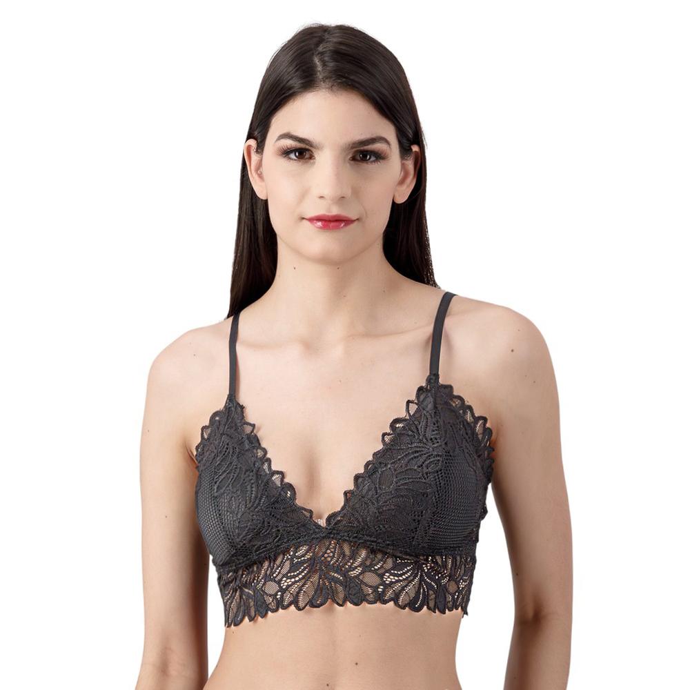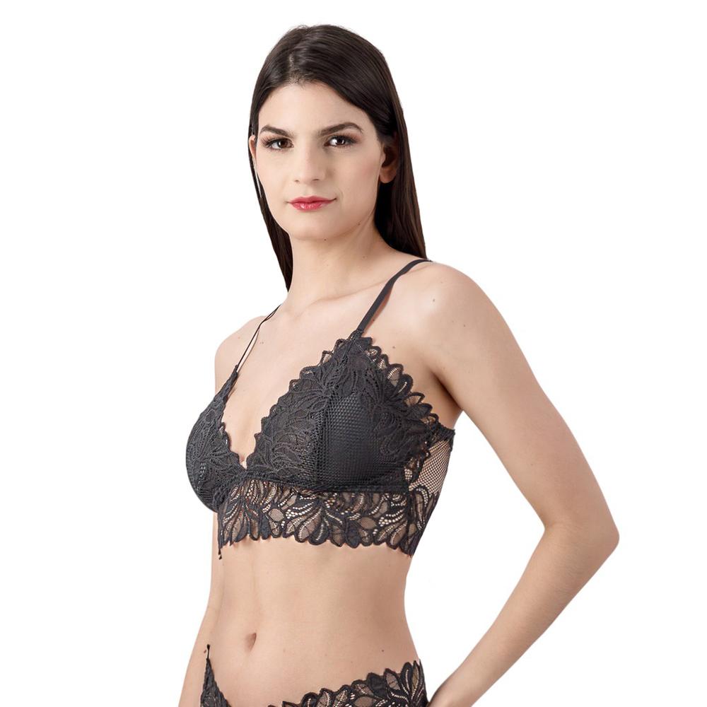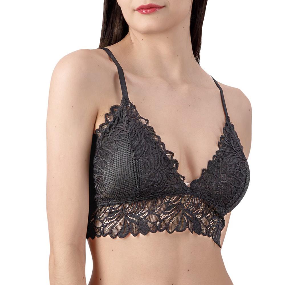 Comodidad absoluta sin perder el estilo. Este brassiere de copas triangulares se distingue por ser sin varillas, ideal para quienes buscan una sensación de libertad. Su diseño de encaje floral y talle largo lo convierten en una pieza tipo bralette muy elegante.