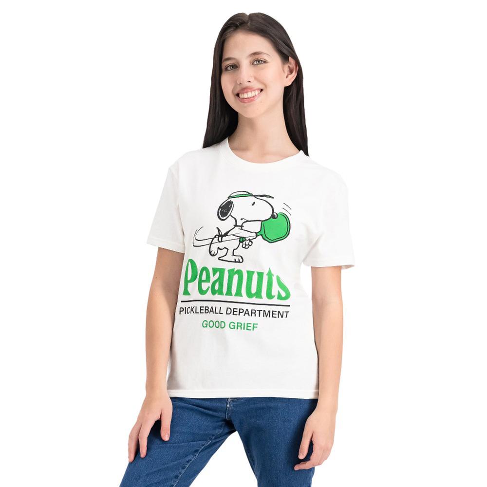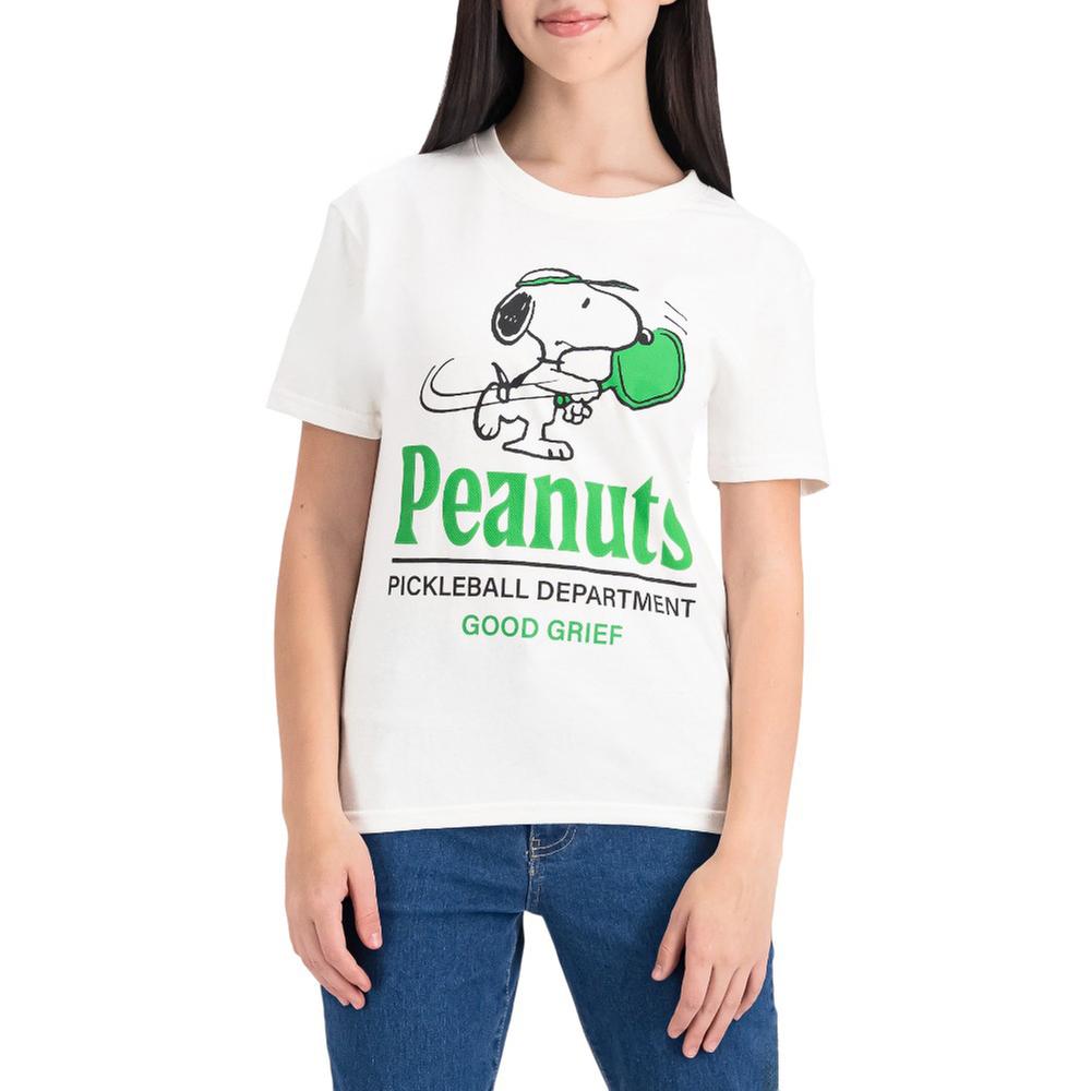Atributos: Mangas cortas cómodas y frescas Cuello redondo clásico y funcional Estampado frontal de Snoopy llamativo y divertido